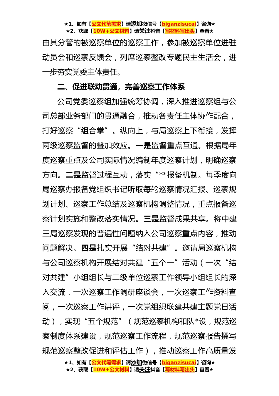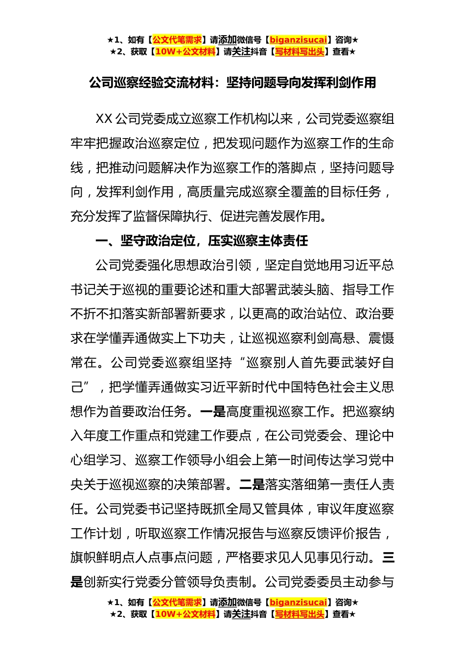 ★1、如有【公文代笔需求】请添加微信号【biganzisucai】咨询★★2、获取【10W+公文材料】请关注抖音【写材料写出头】查看★公司巡察经验交流材料:坚持问题导向发挥利剑作用XX公司党委成立巡察工作机构以来,公司党委巡察组牢牢把握政治巡察定位,把发现问题作为巡察工作的生命线,把推动问题解决作为巡察工作的落脚点,坚持问题导向,发挥利剑作用,高质量完成巡察全覆盖的目标任务,充分发挥了监督保障执行、促进完善发展作用。一、坚守政治定位,压实巡察主体责任公司党委强化思想政治引领,坚定自觉地用习近平总书记关于巡视的重要论述和重大部署武装头脑、指导工作不折不扣落实新部署新要求,以更高的政治站位、政治要求在学懂弄通做实上下功夫,让巡视巡察利剑高悬、震慑常在。公司党委巡察组坚持“巡察别...