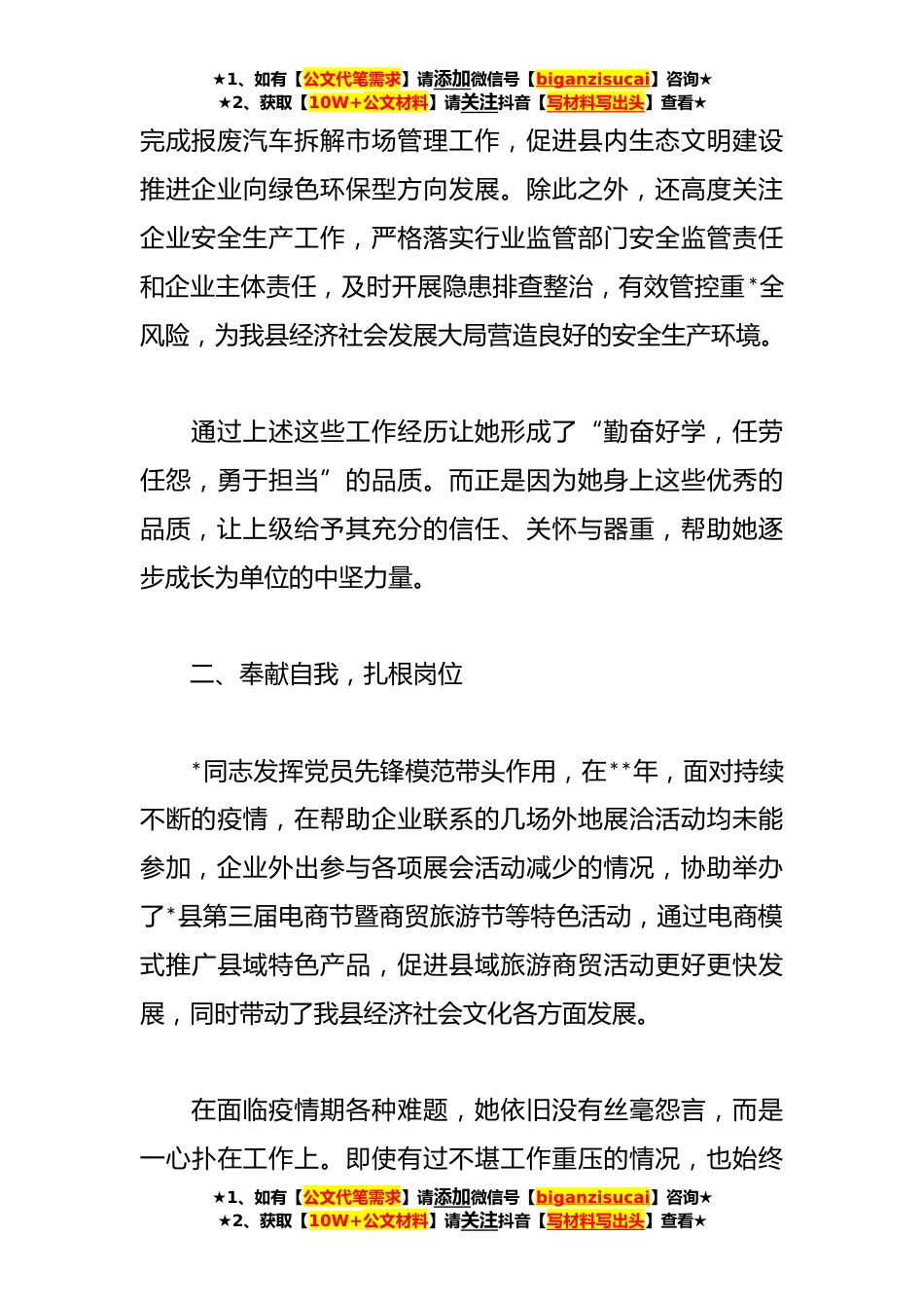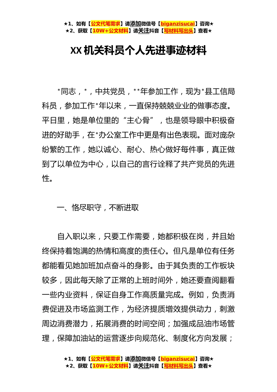★1、如有【公文代笔需求】请添加微信号【biganzisucai】咨询★★2、获取【10W+公文材料】请关注抖音【写材料写出头】查看★XX机关科员个人先进事迹材料*同志,*,中共党员,**年参加工作,现为*县工信局科员,参加工作*年以来,一直保持兢兢业业的做事态度。平日里,她是单位里的“主心骨”,也是领导眼中积极奋进的好助手,在*办公室工作中更是有出色表现。面对庞杂纷繁的工作,她以诚心、耐心、热心做好每件事,真正做到了以单位为中心,以自己的言行诠释了共产党员的先进性。一、恪尽职守,不断进取自入职以来,只要工作需要,她都积极在岗,并且始终保持着饱满的热情和高度的责任心。但凡是单位有任务都能看见她加班加点奋斗的身影。由于其负责的工作板块较多,因此每天除了正常的上班时间外,她还要查阅翻看...