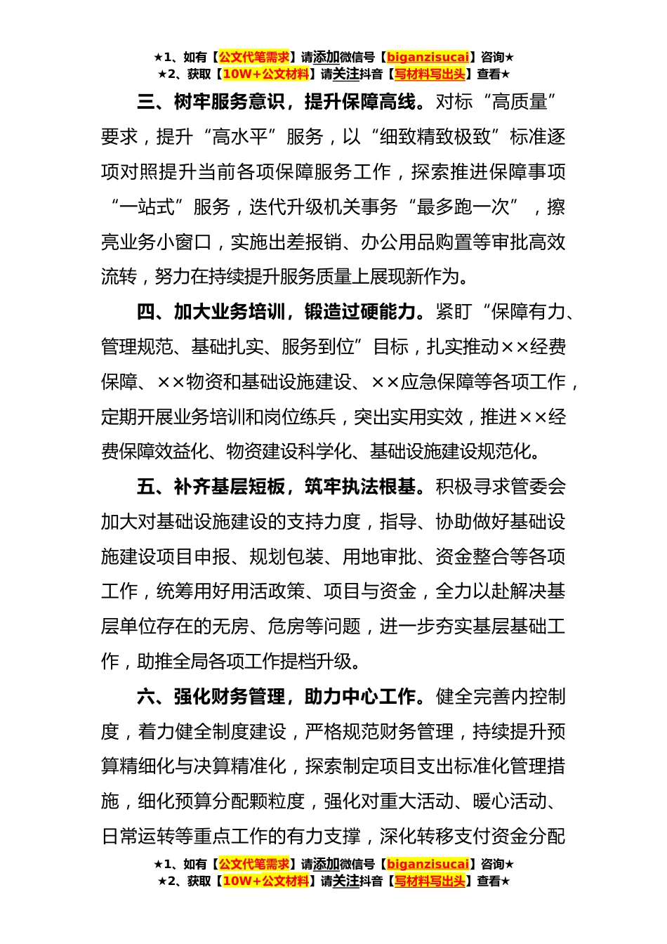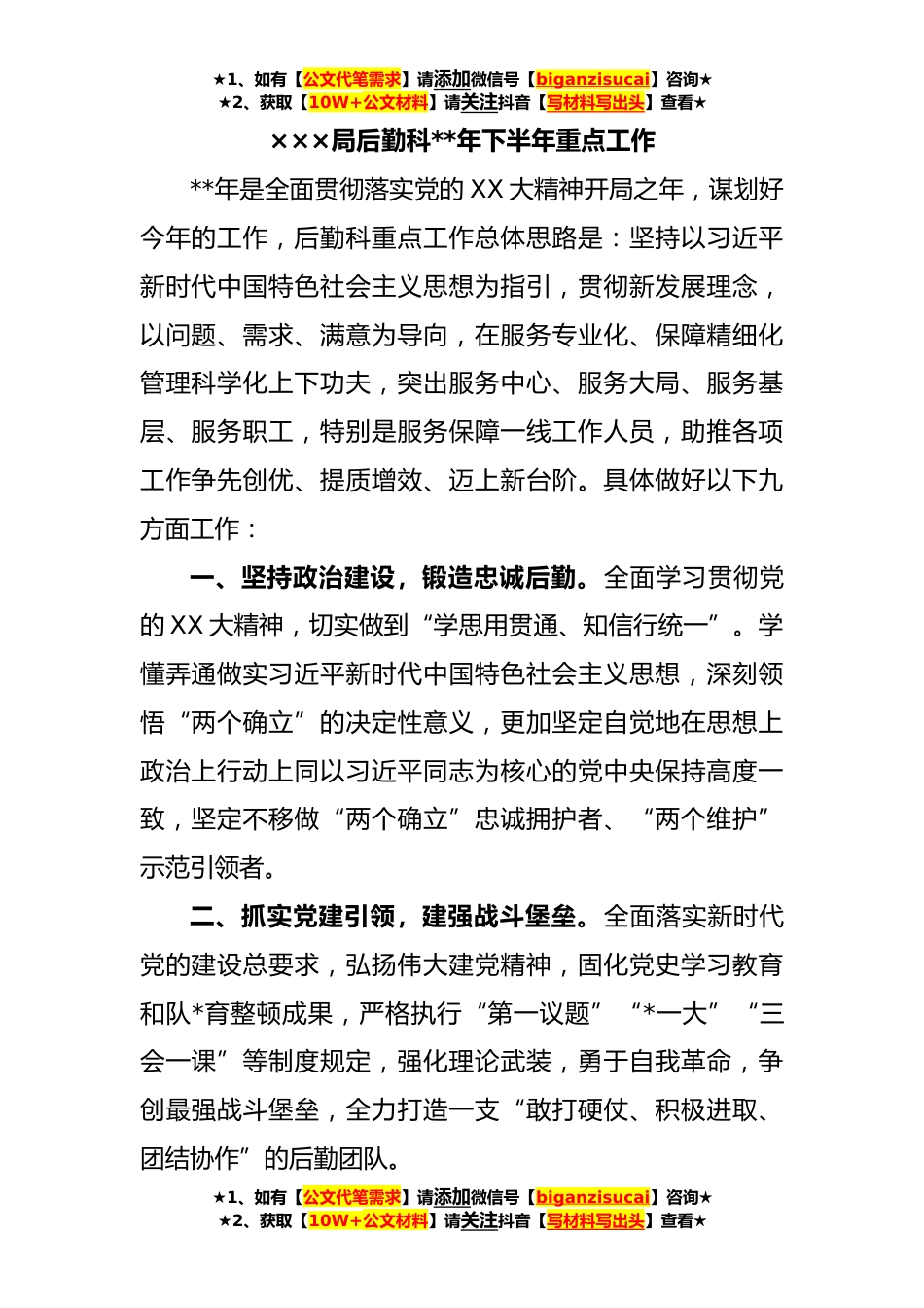 ★1、如有【公文代笔需求】请添加微信号【biganzisucai】咨询★★2、获取【10W+公文材料】请关注抖音【写材料写出头】查看★×××局后勤科**年下半年重点工作**年是全面贯彻落实党的XX大精神开局之年,谋划好今年的工作,后勤科重点工作总体思路是:坚持以习近平新时代中国特色社会主义思想为指引,贯彻新发展理念,以问题、需求、满意为导向,在服务专业化、保障精细化管理科学化上下功夫,突出服务中心、服务大局、服务基层、服务职工,特别是服务保障一线工作人员,助推各项工作争先创优、提质增效、迈上新台阶。具体做好以下九方面工作:一、坚持政治建设,锻造忠诚后勤。全面学习贯彻党的XX大精神,切实做到“学思用贯通、知信行统一”。学懂弄通做实习近平新时代中国特色社会主义思想,深刻领悟“两个确立...