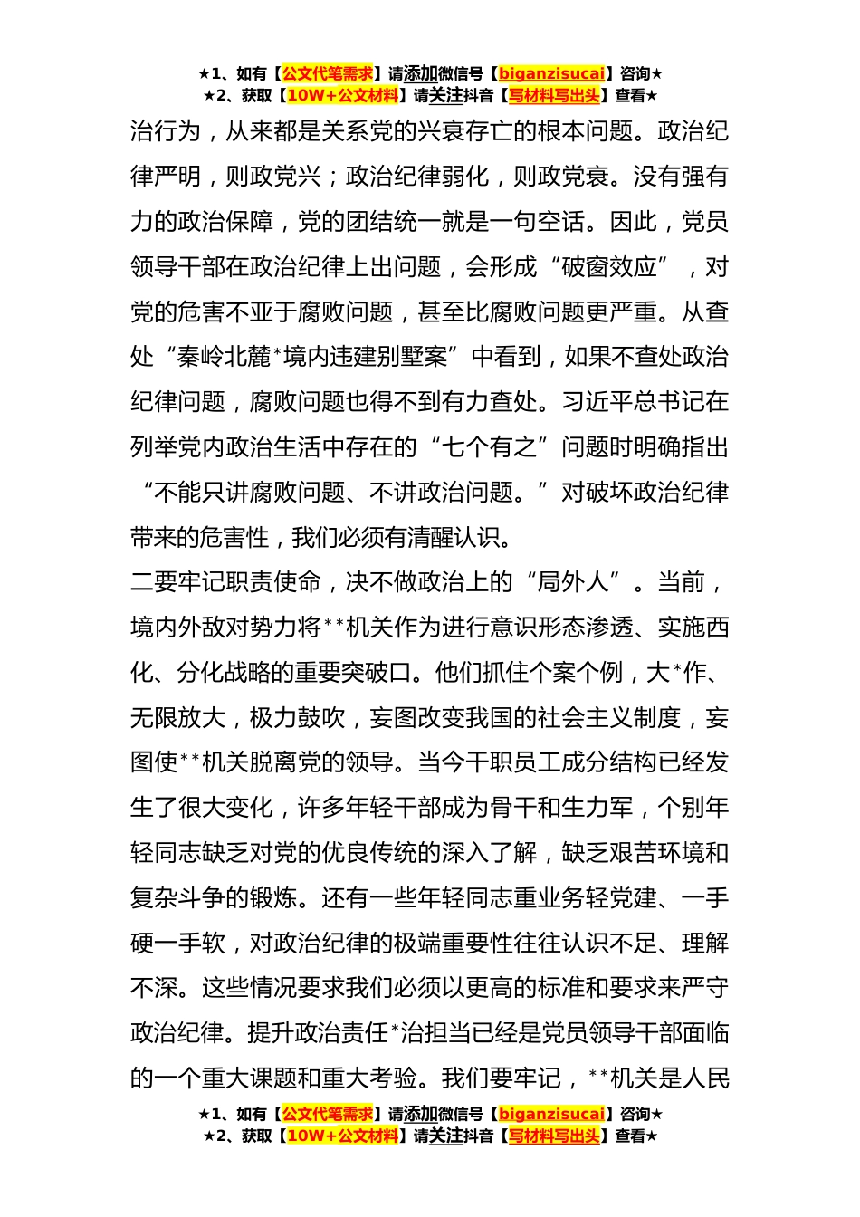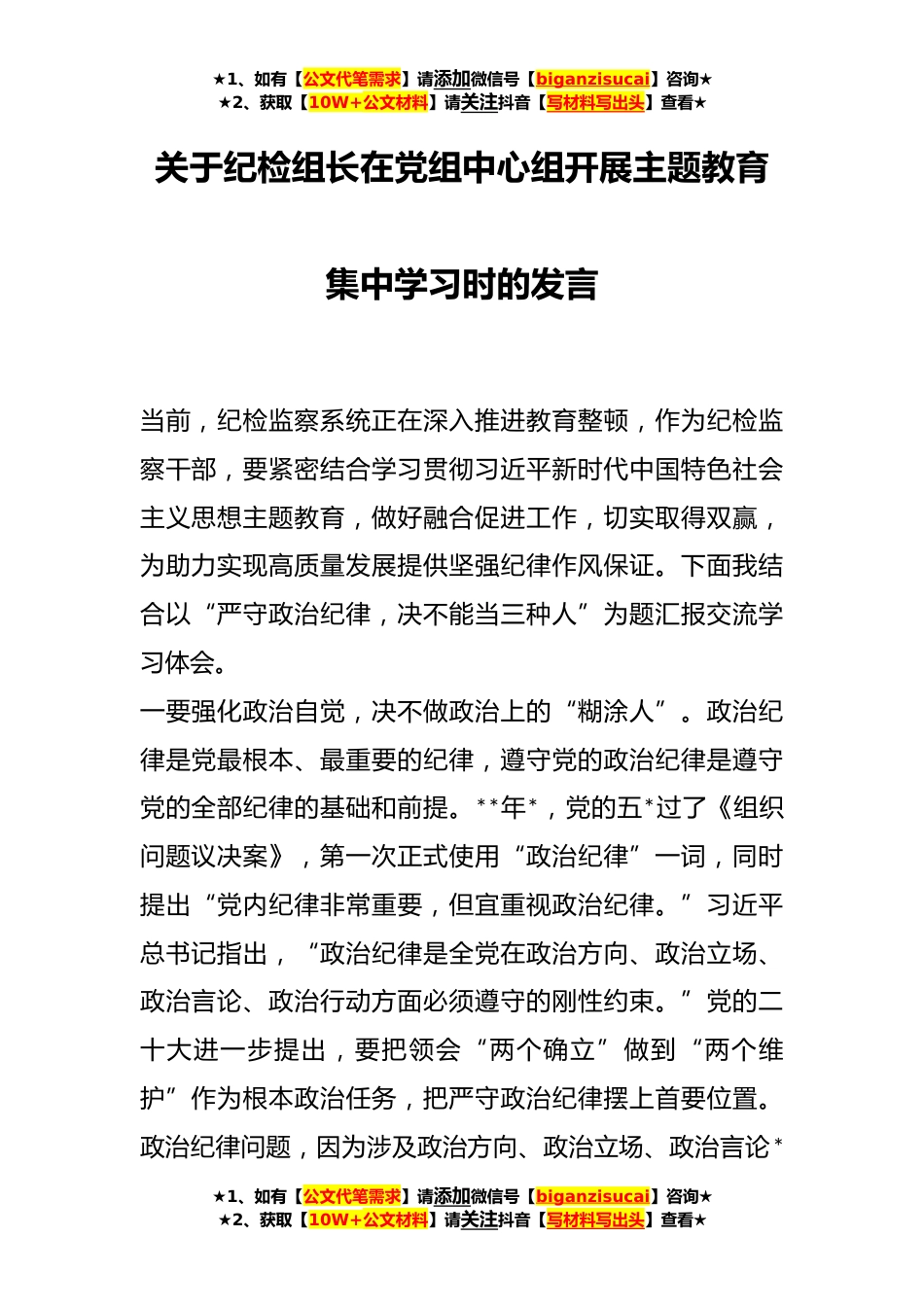 ★1、如有【公文代笔需求】请添加微信号【biganzisucai】咨询★★2、获取【10W+公文材料】请关注抖音【写材料写出头】查看★关于纪检组长在党组中心组开展主题教育集中学习时的发言当前,纪检监察系统正在深入推进教育整顿,作为纪检监察干部,要紧密结合学习贯彻习近平新时代中国特色社会主义思想主题教育,做好融合促进工作,切实取得双赢,为助力实现高质量发展提供坚强纪律作风保证。下面我结合以“严守政治纪律,决不能当三种人”为题汇报交流学习体会。一要强化政治自觉,决不做政治上的“糊涂人”。政治纪律是党最根本、最重要的纪律,遵守党的政治纪律是遵守党的全部纪律的基础和前提。**年*,党的五*过了《组织问题议决案》,第一次正式使用“政治纪律”一词,同时提出“党内纪律非常重要,但宜重视政治...