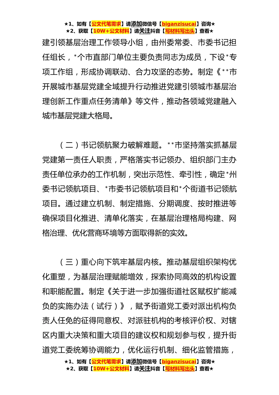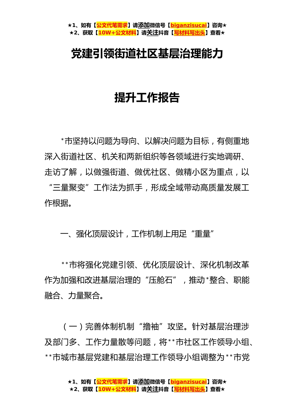 ★1、如有【公文代笔需求】请添加微信号【biganzisucai】咨询★★2、获取【10W+公文材料】请关注抖音【写材料写出头】查看★党建引领街道社区基层治理能力提升工作报告*市坚持以问题为导向、以解决问题为目标,有侧重地深入街道社区、机关和两新组织等各领域进行实地调研、走访了解,以做强街道、做优社区、做精小区为重点,以“三量聚变”工作法为抓手,形成全域带动高质量发展工作根据。一、强化顶层设计,工作机制上用足“重量”**市将强化党建引领、优化顶层设计、深化机制改革作为加强和改进基层治理的“压舱石”,推动*整合、职能融合、力量聚合。(一)完善体制机制“撸袖”攻坚。针对基层治理涉及部门多、工作力量散等问题,将**市社区工作领导小组、**市城市基层党建和基层治理工作领导小组调整为**市党...