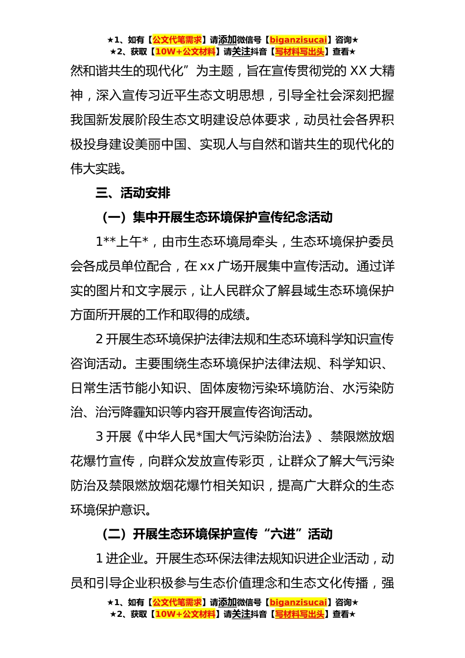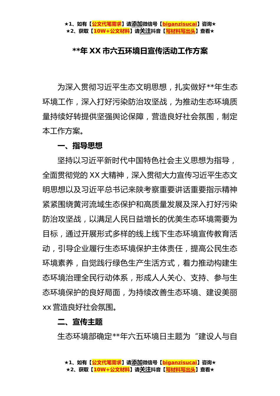 ★1、如有【公文代笔需求】请添加微信号【biganzisucai】咨询★★2、获取【10W+公文材料】请关注抖音【写材料写出头】查看★**年XX市六五环境日宣传活动工作方案为深入贯彻习近平生态文明思想,扎实做好**年生态环境工作,深入打好污染防治攻坚战,为推动生态环境质量持续好转提供坚强舆论保障,营造良好社会氛围,制定本工作方案。一、指导思想坚持以习近平新时代中国特色社会主义思想为指导,全面贯彻党的XX大精神,深入贯彻大力宣传习近平生态文明思想以及习近平总书记来陕考察重要讲话重要指示精神紧紧围绕黄河流域生态保护和高质量发展及深入打好污染防治攻坚战,以满足人民日益增长的优美生态环境需要为目标,通过开展形式多样的线上线下生态环境宣传教育活动,引导企业履行生态环境保护主体责任,提高公民...