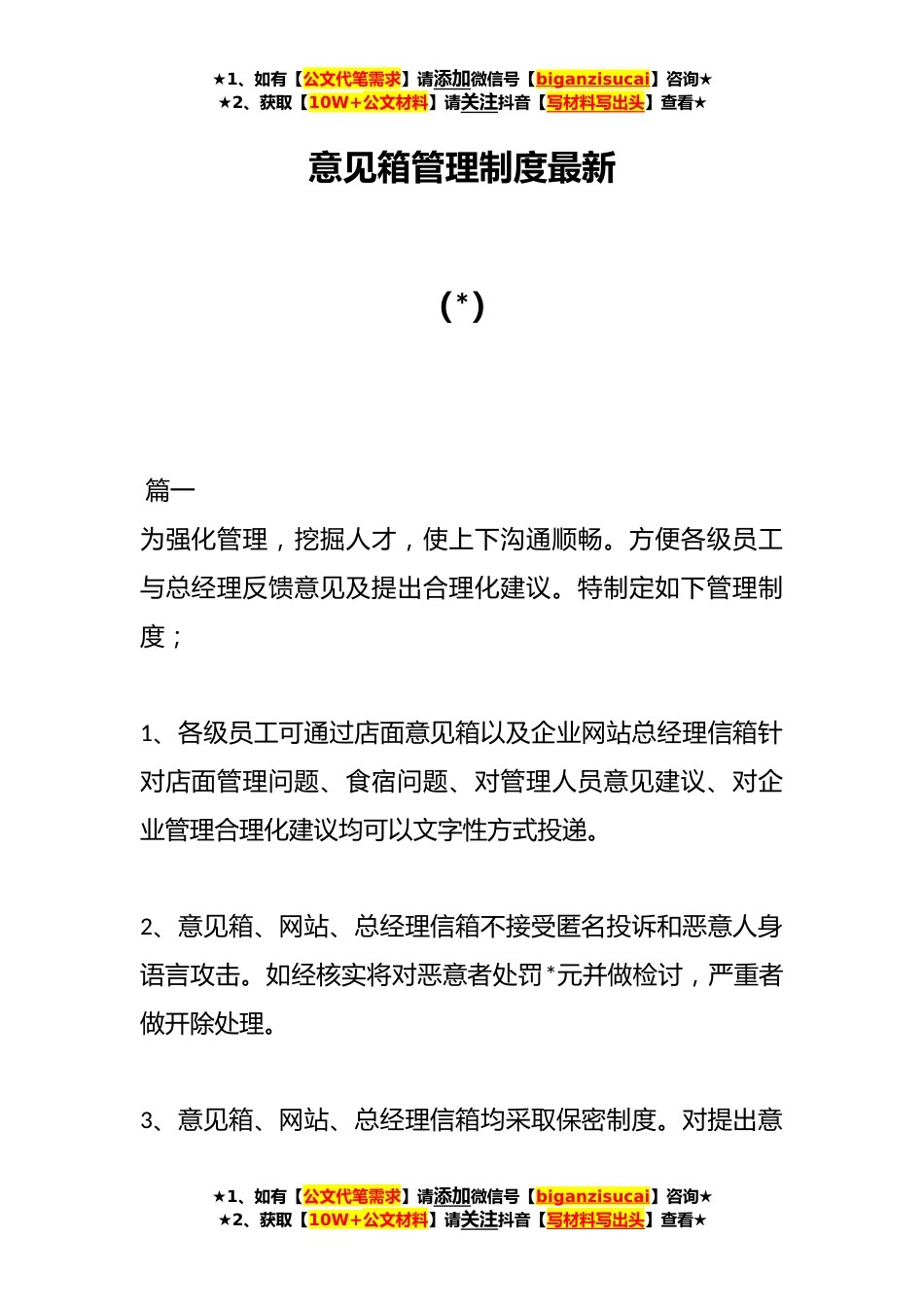 ★1、如有【公文代笔需求】请添加微信号【biganzisucai】咨询★★2、获取【10W+公文材料】请关注抖音【写材料写出头】查看★意见箱管理制度最新(*)篇一为强化管理,挖掘人才,使上下沟通顺畅。方便各级员工与总经理反馈意见及提出合理化建议。特制定如下管理制度;1、各级员工可通过店面意见箱以及企业网站总经理信箱针对店面管理问题、食宿问题、对管理人员意见建议、对企业管理合理化建议均可以文字性方式投递。2、意见箱、网站、总经理信箱不接受匿名投诉和恶意人身语言攻击。如经核实将对恶意者处罚*元并做检讨,严重者做开除处理。3、意见箱、网站、总经理信箱均采取保密制度。对提出意★1、如有【公文代笔需求】请添加微信号【biganzisucai】咨询★★2、获取【10W+公文材料】请关注抖音【写材料写出头】查...
