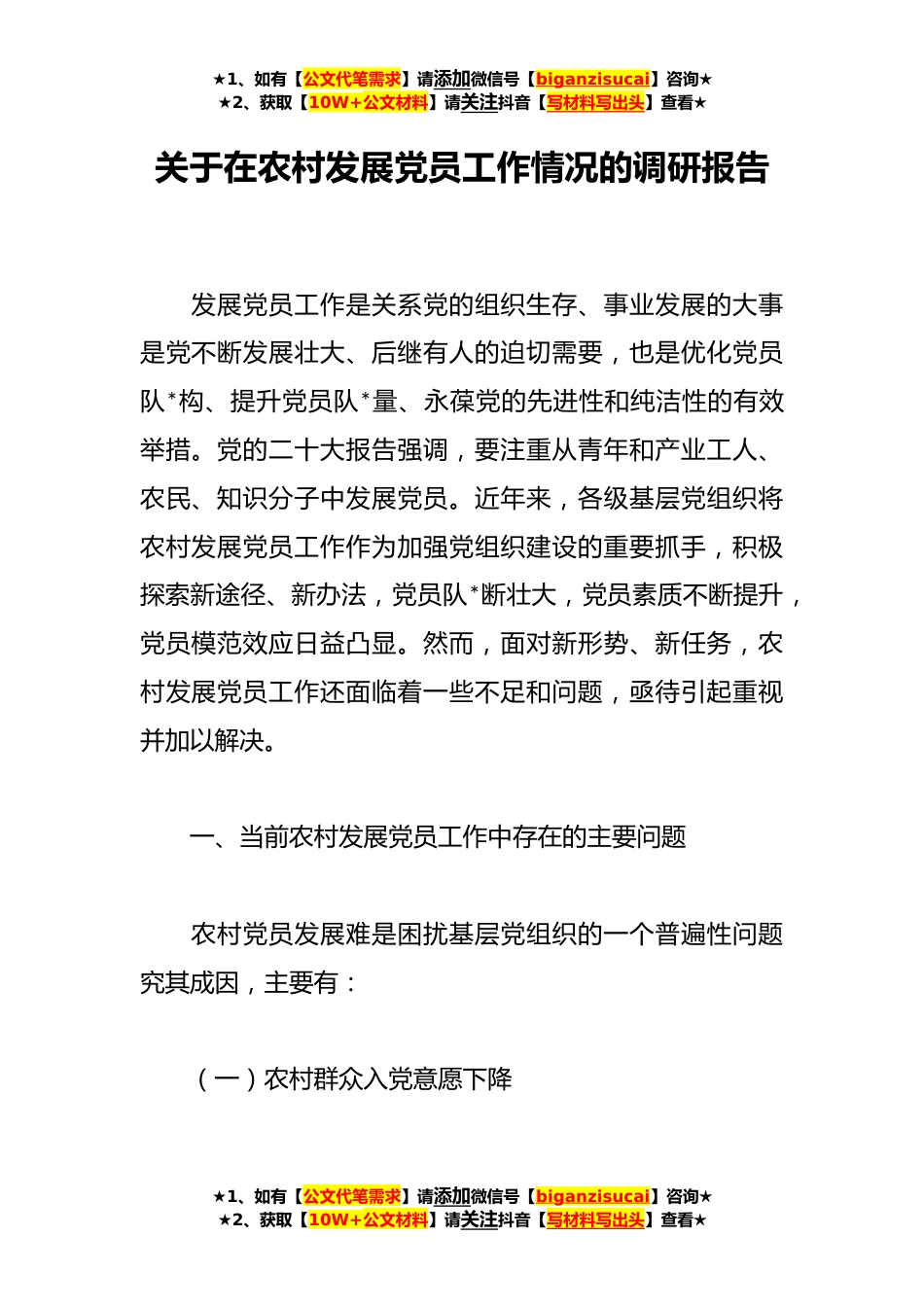 ★1、如有【公文代笔需求】请添加微信号【biganzisucai】咨询★★2、获取【10W+公文材料】请关注抖音【写材料写出头】查看★关于在农村发展党员工作情况的调研报告发展党员工作是关系党的组织生存、事业发展的大事是党不断发展壮大、后继有人的迫切需要,也是优化党员队*构、提升党员队*量、永葆党的先进性和纯洁性的有效举措。党的二十大报告强调,要注重从青年和产业工人、农民、知识分子中发展党员。近年来,各级基层党组织将农村发展党员工作作为加强党组织建设的重要抓手,积极探索新途径、新办法,党员队*断壮大,党员素质不断提升,党员模范效应日益凸显。然而,面对新形势、新任务,农村发展党员工作还面临着一些不足和问题,亟待引起重视并加以解决。一、当前农村发展党员工作中存在的主要问题农村党员发...
