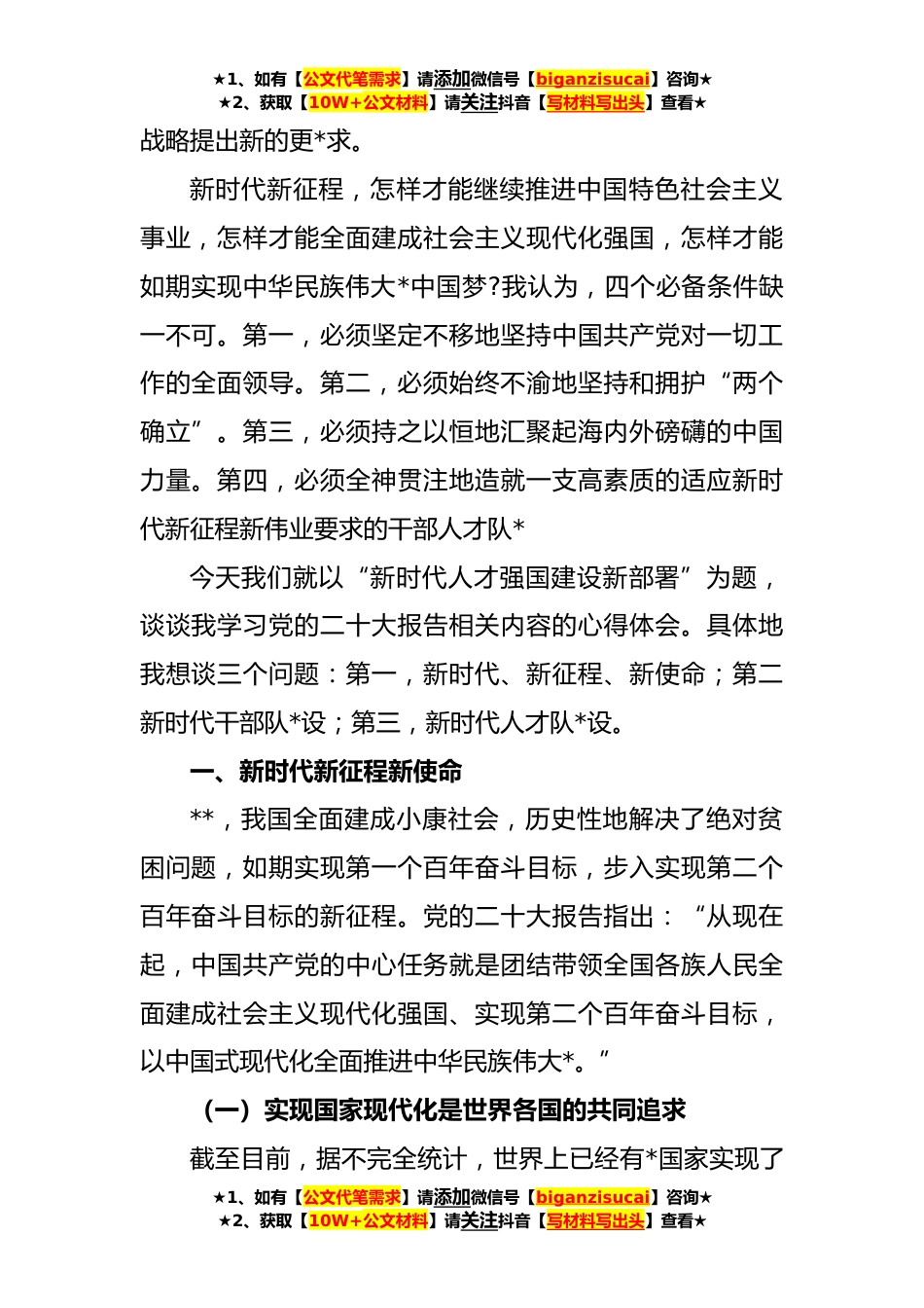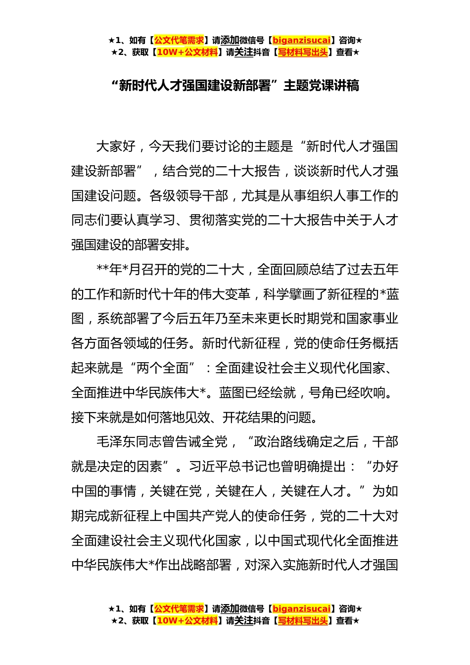 ★1、如有【公文代笔需求】请添加微信号【biganzisucai】咨询★★2、获取【10W+公文材料】请关注抖音【写材料写出头】查看★“新时代人才强国建设新部署”主题党课讲稿大家好,今天我们要讨论的主题是“新时代人才强国建设新部署”,结合党的二十大报告,谈谈新时代人才强国建设问题。各级领导干部,尤其是从事组织人事工作的同志们要认真学习、贯彻落实党的二十大报告中关于人才强国建设的部署安排。**年*月召开的党的二十大,全面回顾总结了过去五年的工作和新时代十年的伟大变革,科学擘画了新征程的*蓝图,系统部署了今后五年乃至未来更长时期党和国家事业各方面各领域的任务。新时代新征程,党的使命任务概括起来就是“两个全面”:全面建设社会主义现代化国家、全面推进中华民族伟大*。蓝图已经绘就,号角已...