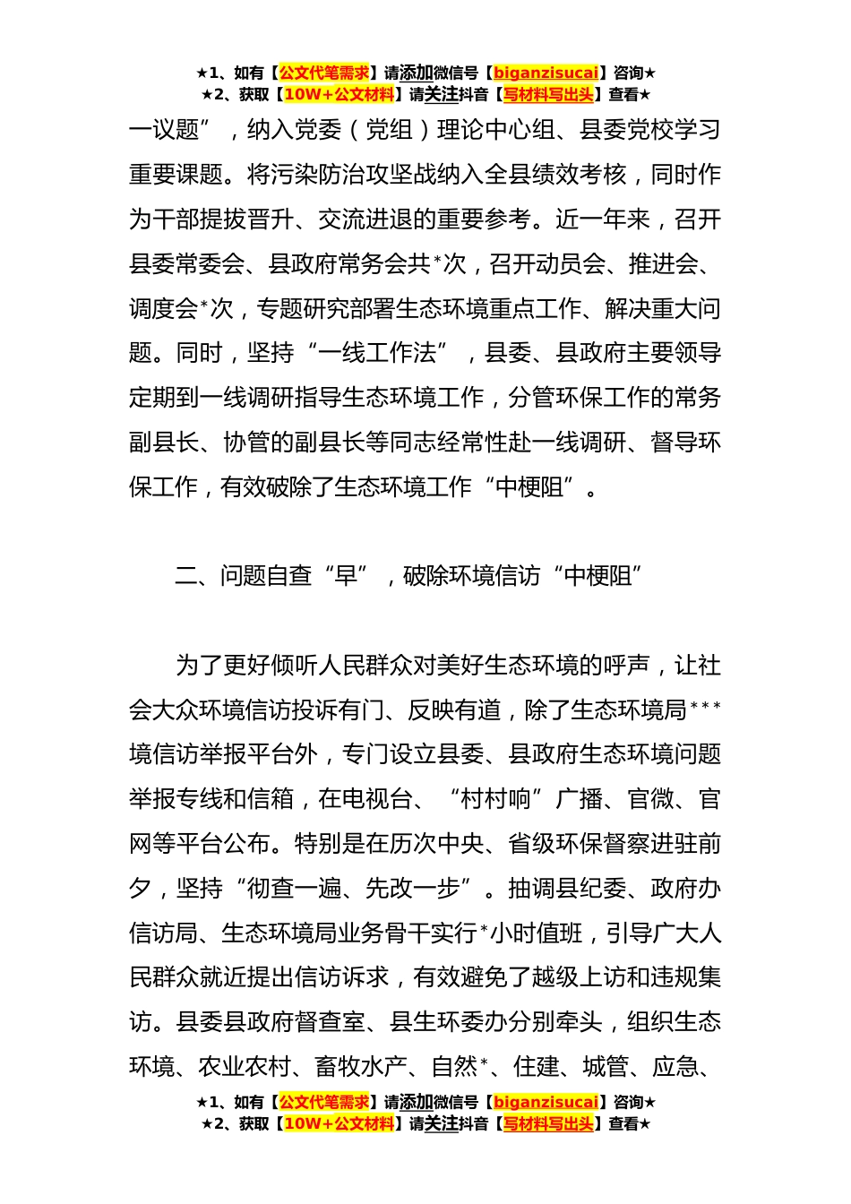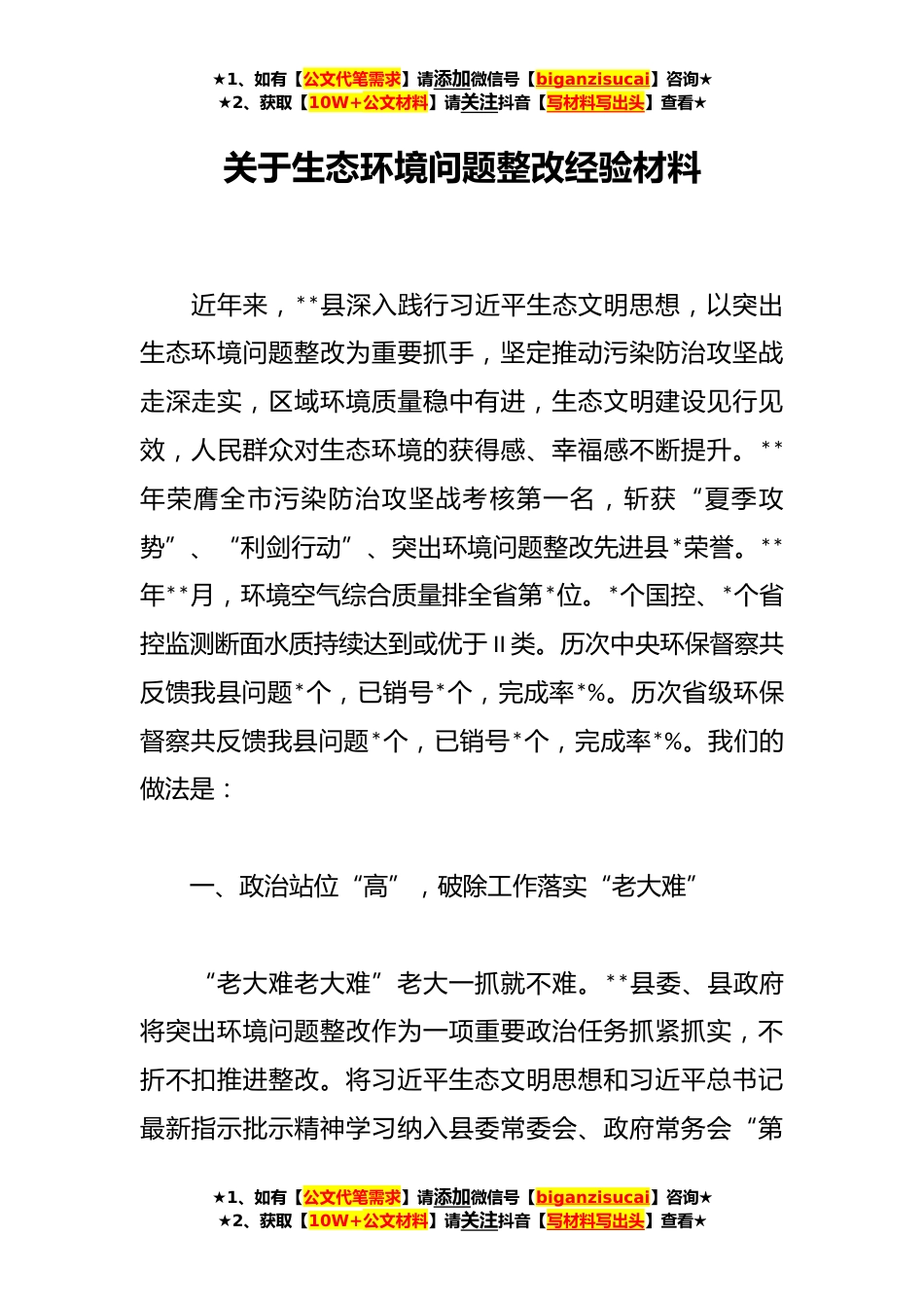 ★1、如有【公文代笔需求】请添加微信号【biganzisucai】咨询★★2、获取【10W+公文材料】请关注抖音【写材料写出头】查看★关于生态环境问题整改经验材料近年来,**县深入践行习近平生态文明思想,以突出生态环境问题整改为重要抓手,坚定推动污染防治攻坚战走深走实,区域环境质量稳中有进,生态文明建设见行见效,人民群众对生态环境的获得感、幸福感不断提升。**年荣膺全市污染防治攻坚战考核第一名,斩获“夏季攻势”、“利剑行动”、突出环境问题整改先进县*荣誉。**年**月,环境空气综合质量排全省第*位。*个国控、*个省控监测断面水质持续达到或优于II类。历次中央环保督察共反馈我县问题*个,已销号*个,完成率*%。历次省级环保督察共反馈我县问题*个,已销号*个,完成率*%。我们的做法是:一、政治站位...