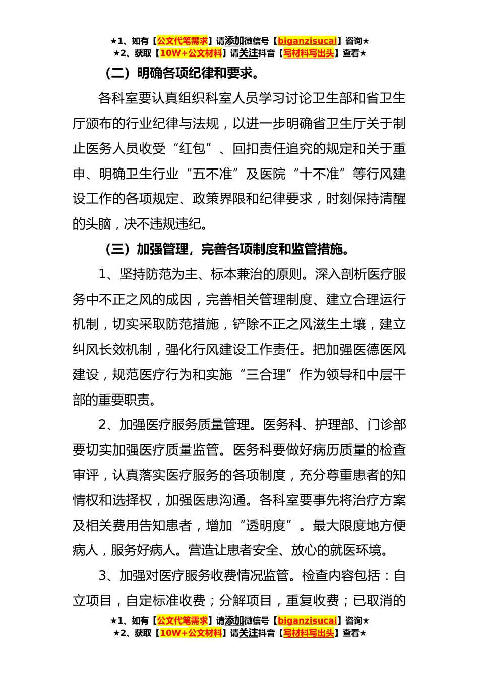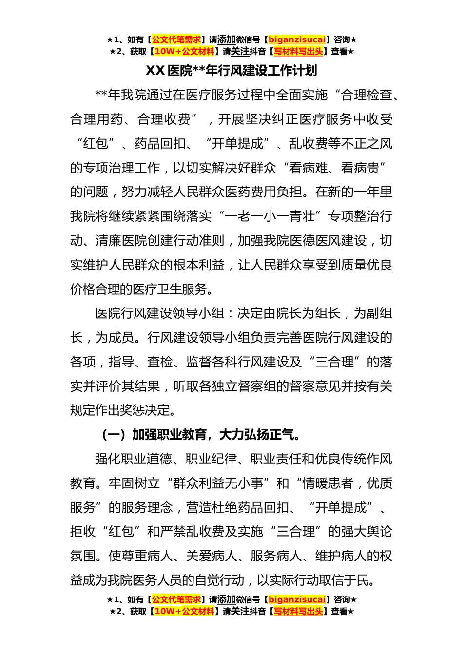 ★1、如有【公文代笔需求】请添加微信号【biganzisucai】咨询★★2、获取【10W+公文材料】请关注抖音【写材料写出头】查看★XX医院**年行风建设工作计划**年我院通过在医疗服务过程中全面实施“合理检查、合理用药、合理收费”,开展坚决纠正医疗服务中收受“红包”、药品回扣、“开单提成”、乱收费等不正之风的专项治理工作,以切实解决好群众“看病难、看病贵”的问题,努力减轻人民群众医药费用负担。在新的一年里我院将继续紧紧围绕落实“一老一小一青壮”专项整治行动、清廉医院创建行动准则,加强我院医德医风建设,切实维护人民群众的根本利益,让人民群众享受到质量优良价格合理的医疗卫生服务。医院行风建设领导小组:决定由院长为组长,为副组长,为成员。行风建设领导小组负责完善医院行风建设的各项...