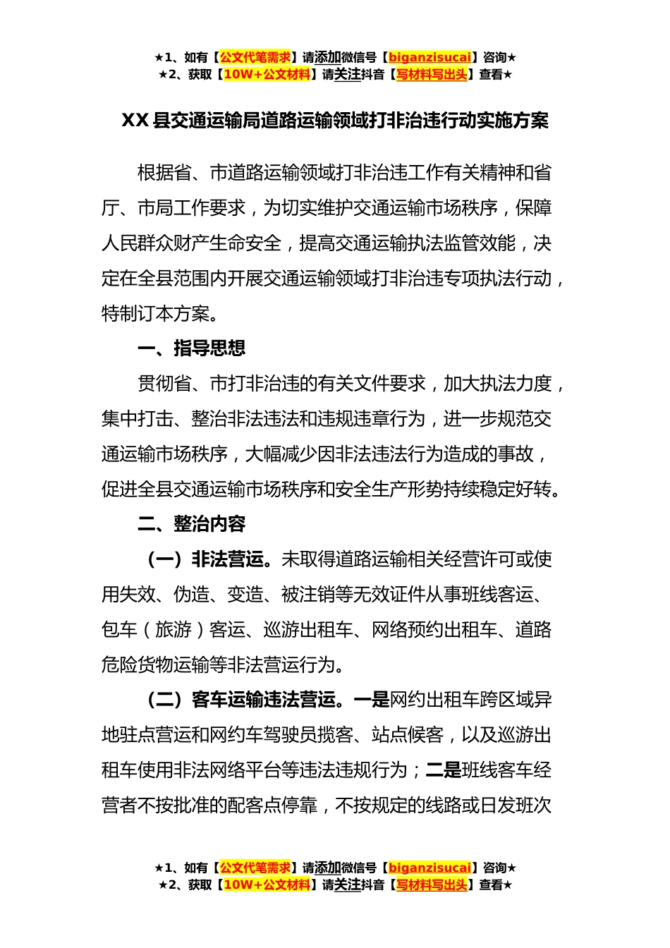 ★1、如有【公文代笔需求】请添加微信号【biganzisucai】咨询★★2、获取【10W+公文材料】请关注抖音【写材料写出头】查看★XX县交通运输局道路运输领域打非治违行动实施方案根据省、市道路运输领域打非治违工作有关精神和省厅、市局工作要求,为切实维护交通运输市场秩序,保障人民群众财产生命安全,提高交通运输执法监管效能,决定在全县范围内开展交通运输领域打非治违专项执法行动,特制订本方案。一、指导思想贯彻省、市打非治违的有关文件要求,加大执法力度,集中打击、整治非法违法和违规违章行为,进一步规范交通运输市场秩序,大幅减少因非法违法行为造成的事故,促进全县交通运输市场秩序和安全生产形势持续稳定好转。二、整治内容(一)非法营运。未取得道路运输相关经营许可或使用失效、伪造、变造...