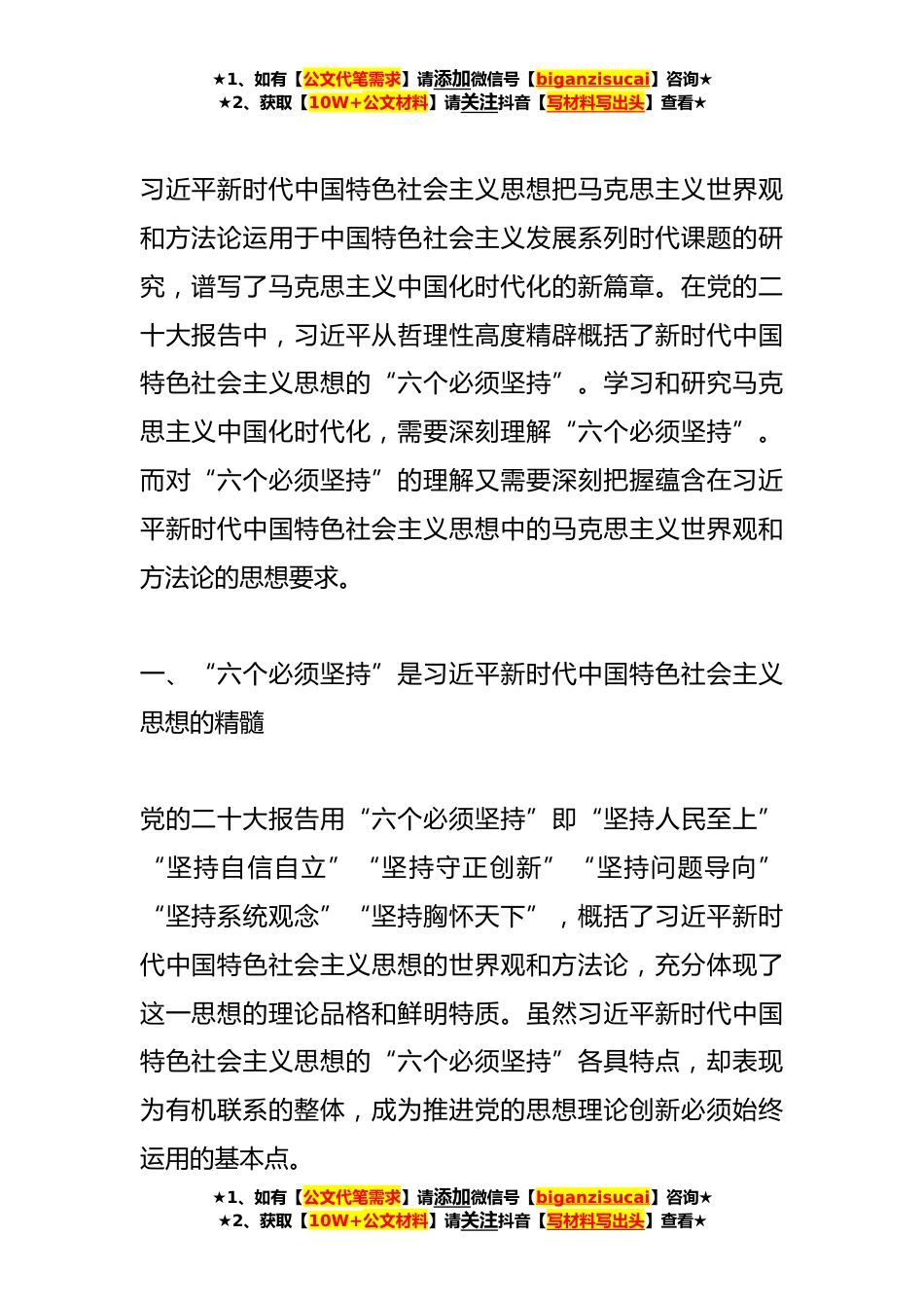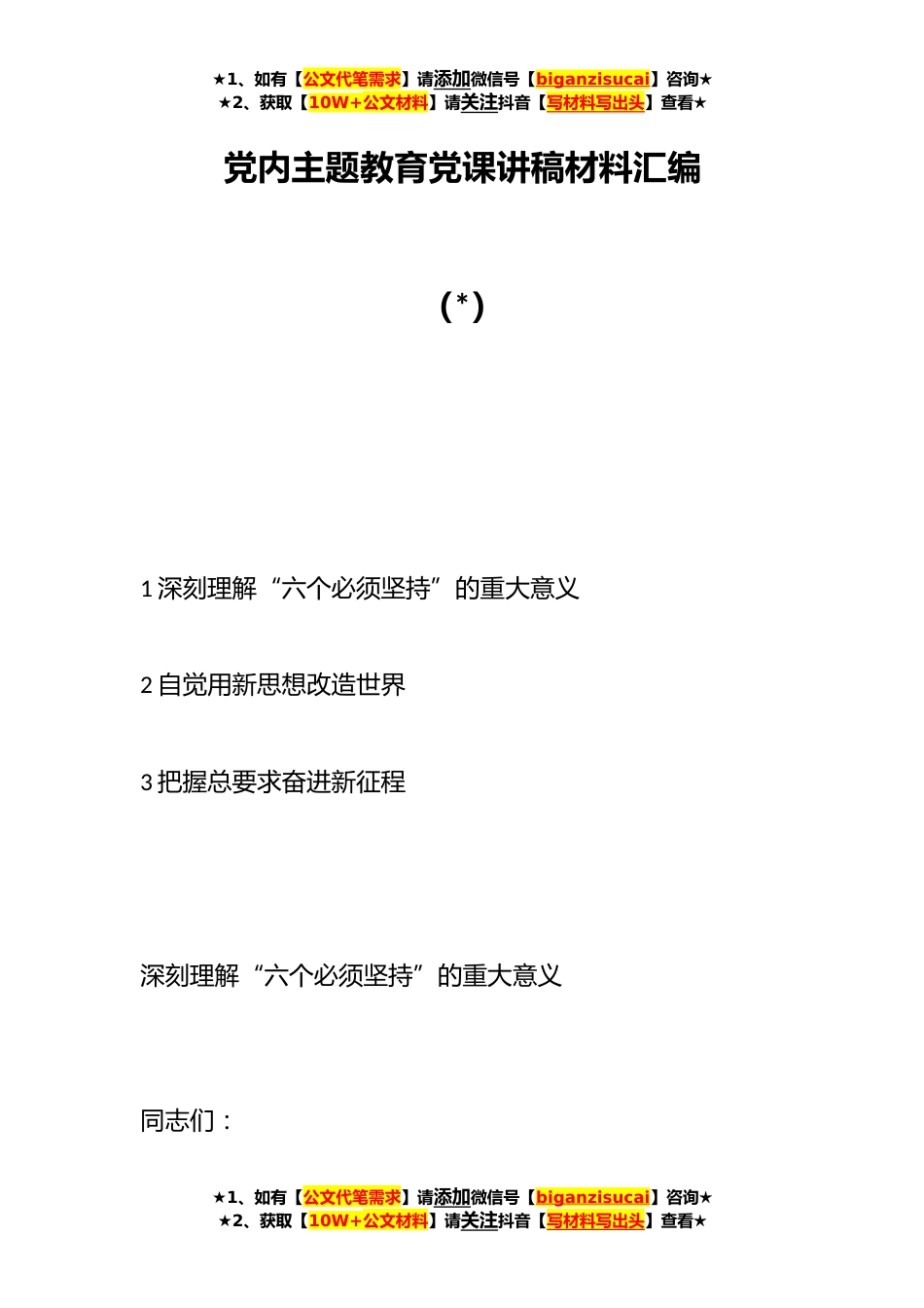 ★1、如有【公文代笔需求】请添加微信号【biganzisucai】咨询★★2、获取【10W+公文材料】请关注抖音【写材料写出头】查看★党内主题教育党课讲稿材料汇编(*)1深刻理解“六个必须坚持”的重大意义2自觉用新思想改造世界3把握总要求奋进新征程深刻理解“六个必须坚持”的重大意义同志们:★1、如有【公文代笔需求】请添加微信号【biganzisucai】咨询★★2、获取【10W+公文材料】请关注抖音【写材料写出头】查看★★1、如有【公文代笔需求】请添加微信号【biganzisucai】咨询★★2、获取【10W+公文材料】请关注抖音【写材料写出头】查看★习近平新时代中国特色社会主义思想把马克思主义世界观和方法论运用于中国特色社会主义发展系列时代课题的研究,谱写了马克思主义中国化时代化的新篇章。在党的二十大报告中,...