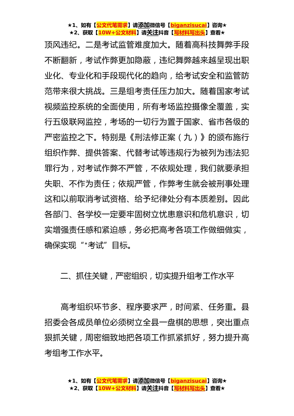 ★1、如有【公文代笔需求】请添加微信号【biganzisucai】咨询★★2、获取【10W+公文材料】请关注抖音【写材料写出头】查看★关于招生委员会在(扩大)高考工作会议上的讲话稿同志们:**年高考在即。今天,我们召开全县招委(扩大)会议,主要任务是贯彻落实国家、省市招生工作会议精神,安排部署今年高考工作,确保今年高考顺利进行。下面,我就顺利实现“*高考”目标,讲三点意见。一、认清形势,高度重视,不断增强工作责任感高考事关广大学子的前途命运,事关社会大局和谐稳定,历来受到全社会的高度关注。客观分析、研判今年招考工作形势,有三个方面必须引起我们的高度重视。一是考风考纪不可忽视。近年来,我县考试工作总体平稳顺利考风考纪端正严明,但还有极个别监考教师、工作人员对考风考纪的重要性认识...