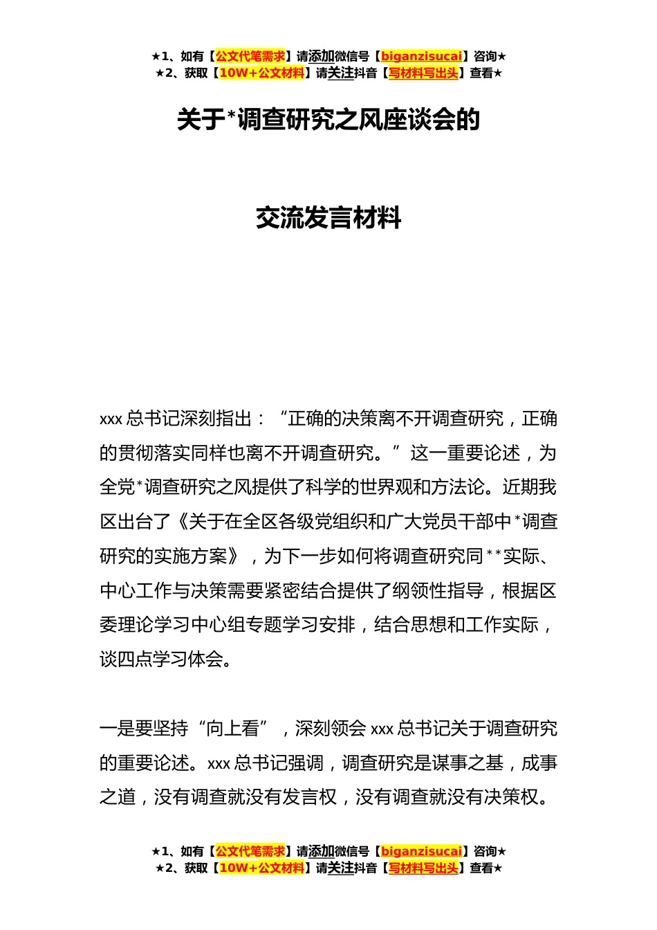 ★1、如有【公文代笔需求】请添加微信号【biganzisucai】咨询★★2、获取【10W+公文材料】请关注抖音【写材料写出头】查看★关于*调查研究之风座谈会的交流发言材料xxx总书记深刻指出:“正确的决策离不开调查研究,正确的贯彻落实同样也离不开调查研究。”这一重要论述,为全党*调查研究之风提供了科学的世界观和方法论。近期我区出台了《关于在全区各级党组织和广大党员干部中*调查研究的实施方案》,为下一步如何将调查研究同**实际、中心工作与决策需要紧密结合提供了纲领性指导,根据区委理论学习中心组专题学习安排,结合思想和工作实际,谈四点学习体会。一是要坚持“向上看”,深刻领会xxx总书记关于调查研究的重要论述。xxx总书记强调,调查研究是谋事之基,成事之道,没有调查就没有发言权,没有调查就...