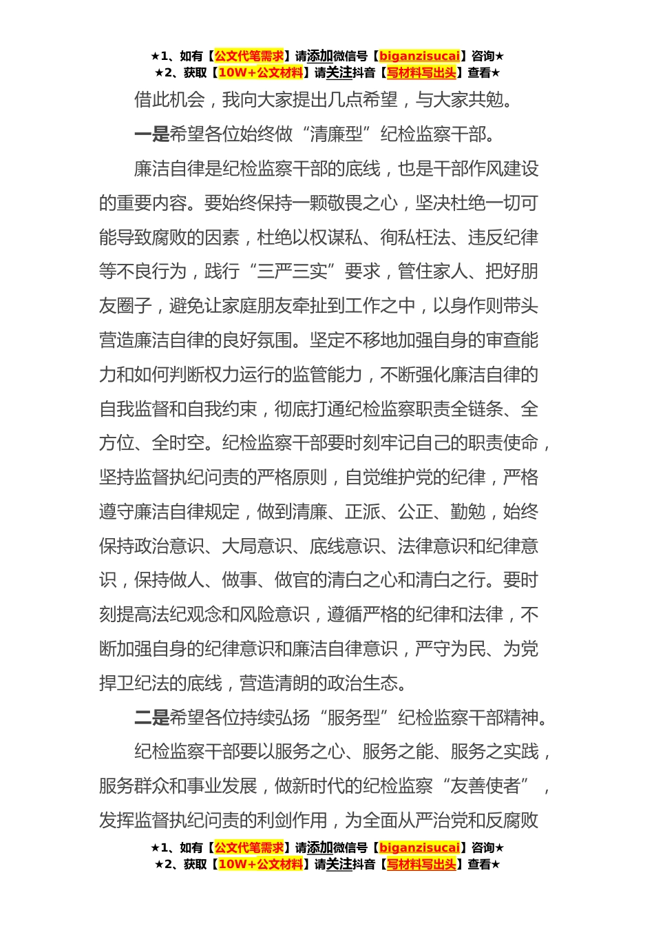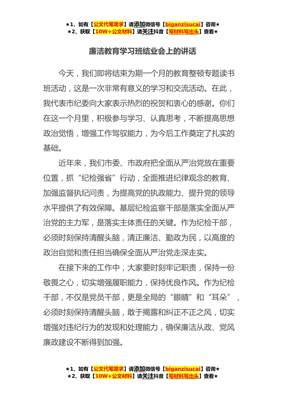 ★1、如有【公文代笔需求】请添加微信号【biganzisucai】咨询★★2、获取【10W+公文材料】请关注抖音【写材料写出头】查看★廉洁教育学习班结业会上的讲话今天,我们即将结束为期一个月的教育整顿专题读书班活动,这是一次非常有意义的学习和交流活动。在此,我代表市纪委向大家表示热烈的祝贺和衷心的感谢。你们在这一个月里,积极参与学习、认真思考,不断提高思想政治觉悟,增强工作驾驭能力,为今后工作奠定了扎实的基础。近年来,我们市委、市政府把全面从严治党放在重要位置,抓“纪检强省”行动,全面推进纪律观念的教育、加强监督执纪问责,为提高党的执政能力、提升党的领导水平提供了有效保障。基层纪检监察干部是落实全面从严治党的主力军,是落实主体责任的关键。作为纪检干部,必须时刻保持清醒头脑...