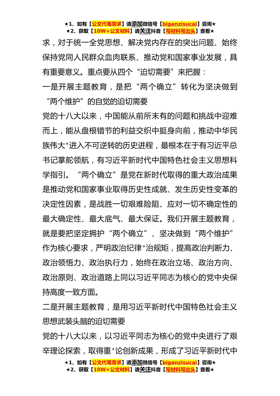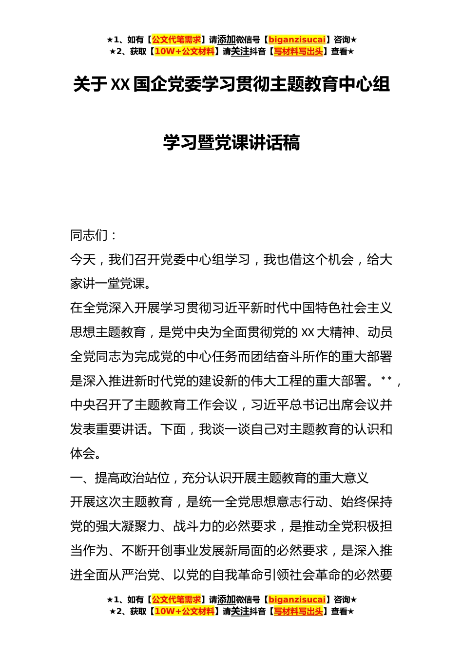 ★1、如有【公文代笔需求】请添加微信号【biganzisucai】咨询★★2、获取【10W+公文材料】请关注抖音【写材料写出头】查看★关于XX国企党委学习贯彻主题教育中心组学习暨党课讲话稿同志们:今天,我们召开党委中心组学习,我也借这个机会,给大家讲一堂党课。在全党深入开展学习贯彻习近平新时代中国特色社会主义思想主题教育,是党中央为全面贯彻党的XX大精神、动员全党同志为完成党的中心任务而团结奋斗所作的重大部署是深入推进新时代党的建设新的伟大工程的重大部署。**,中央召开了主题教育工作会议,习近平总书记出席会议并发表重要讲话。下面,我谈一谈自己对主题教育的认识和体会。一、提高政治站位,充分认识开展主题教育的重大意义开展这次主题教育,是统一全党思想意志行动、始终保持党的强大凝聚力、...