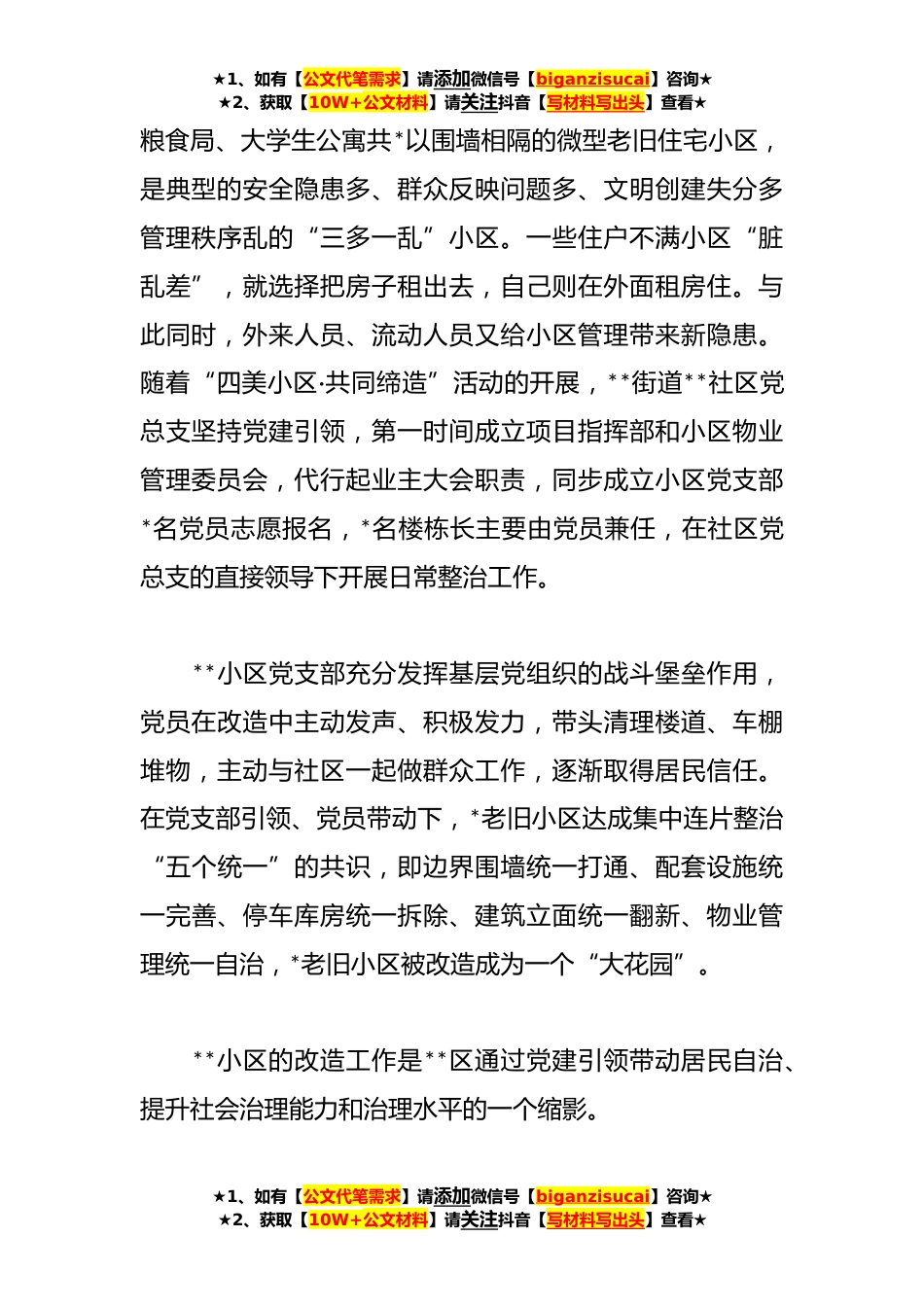 ★1、如有【公文代笔需求】请添加微信号【biganzisucai】咨询★★2、获取【10W+公文材料】请关注抖音【写材料写出头】查看★“四美小区·共同缔造”活动工作报告**省**市**区积极探索党建引领社会治理新路径,结合城市老旧小区改造等重点工作,广泛开展“四美小区·共同缔造”活动,通过建立党建引领下的美好环境与幸福生活“共同缔造”长效机制,发动群众共谋、共建、共管、共评、共享,把城市社区建设成为组织美、环境美、服务美、生活美的幸福家园,群众的积极性、主动性、创造性被充分激发,人居环境明显改善,党的基层基础不断夯实**区被**省民政厅确认为全省社区治理创新实验区。一、党建引领,榜样示范走进**花苑小区,一栋栋居民楼整齐排列,一条条硬化道路干净整洁,儿童游乐场、老年活动室、休闲凉亭等...