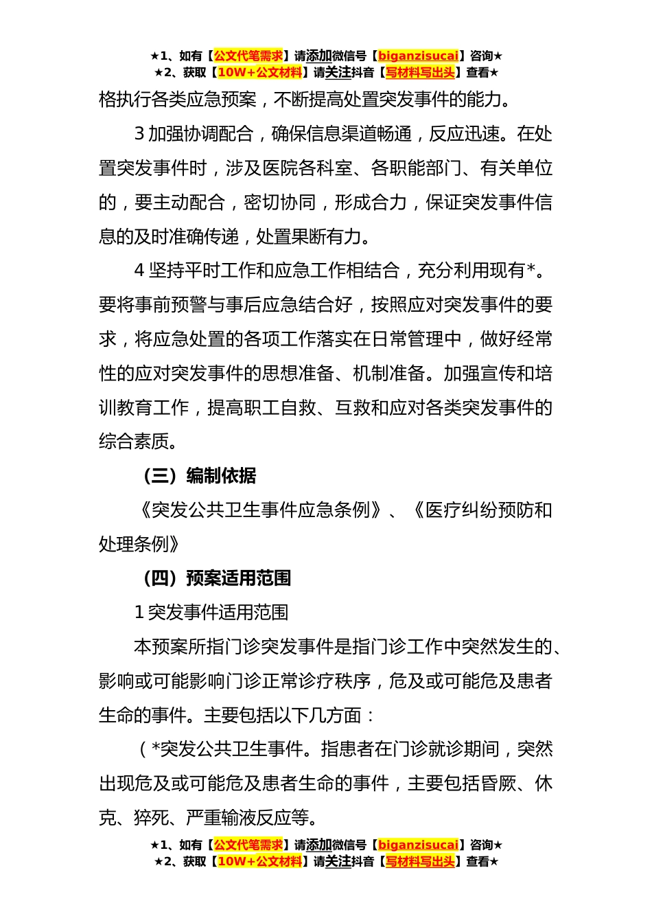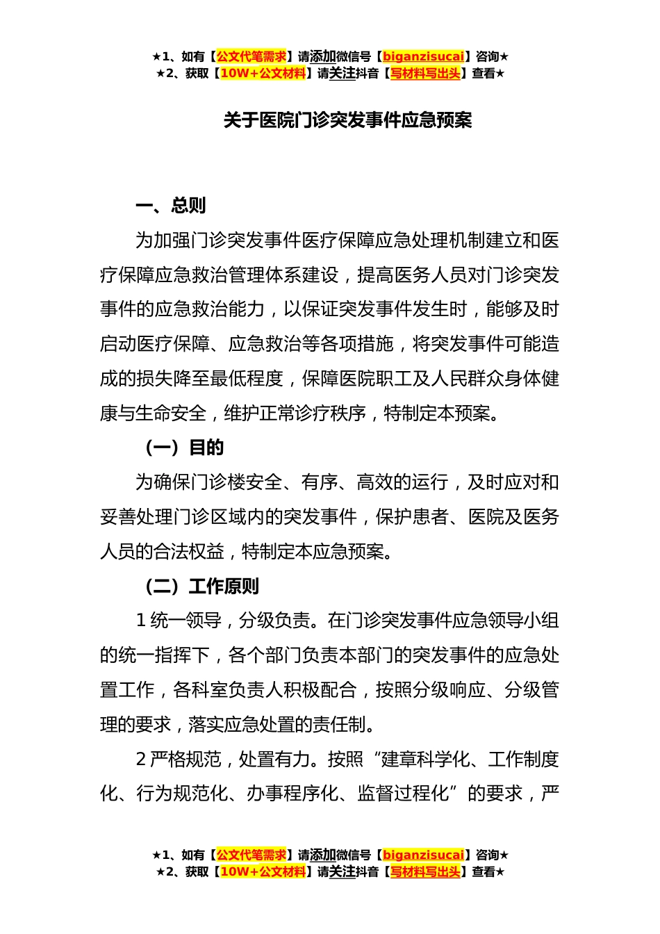 ★1、如有【公文代笔需求】请添加微信号【biganzisucai】咨询★★2、获取【10W+公文材料】请关注抖音【写材料写出头】查看★关于医院门诊突发事件应急预案一、总则为加强门诊突发事件医疗保障应急处理机制建立和医疗保障应急救治管理体系建设,提高医务人员对门诊突发事件的应急救治能力,以保证突发事件发生时,能够及时启动医疗保障、应急救治等各项措施,将突发事件可能造成的损失降至最低程度,保障医院职工及人民群众身体健康与生命安全,维护正常诊疗秩序,特制定本预案。(一)目的为确保门诊楼安全、有序、高效的运行,及时应对和妥善处理门诊区域内的突发事件,保护患者、医院及医务人员的合法权益,特制定本应急预案。(二)工作原则1统一领导,分级负责。在门诊突发事件应急领导小组的统一指挥下,各个...