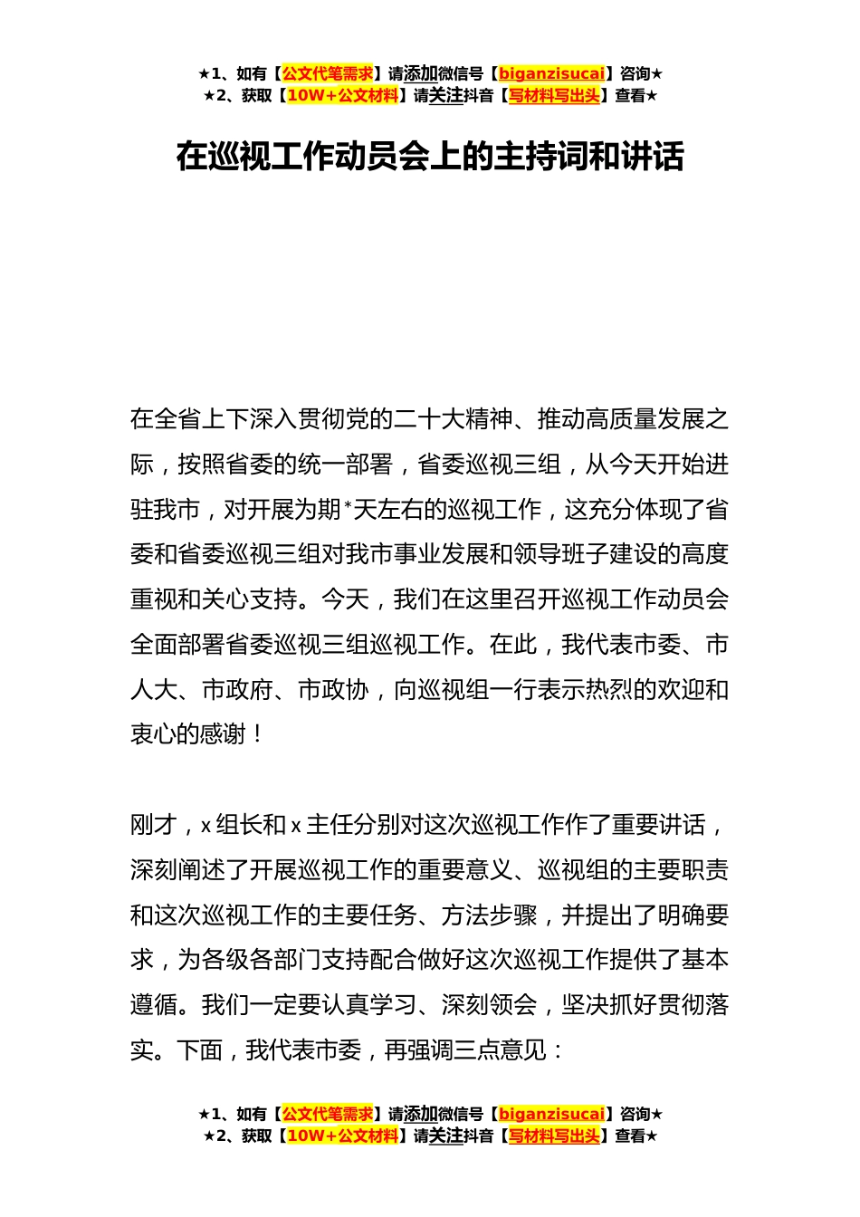 ★1、如有【公文代笔需求】请添加微信号【biganzisucai】咨询★★2、获取【10W+公文材料】请关注抖音【写材料写出头】查看★在巡视工作动员会上的主持词和讲话在全省上下深入贯彻党的二十大精神、推动高质量发展之际,按照省委的统一部署,省委巡视三组,从今天开始进驻我市,对开展为期*天左右的巡视工作,这充分体现了省委和省委巡视三组对我市事业发展和领导班子建设的高度重视和关心支持。今天,我们在这里召开巡视工作动员会全面部署省委巡视三组巡视工作。在此,我代表市委、市人大、市政府、市政协,向巡视组一行表示热烈的欢迎和衷心的感谢!刚才,x组长和x主任分别对这次巡视工作作了重要讲话,深刻阐述了开展巡视工作的重要意义、巡视组的主要职责和这次巡视工作的主要任务、方法步骤,并提出了明确要求...