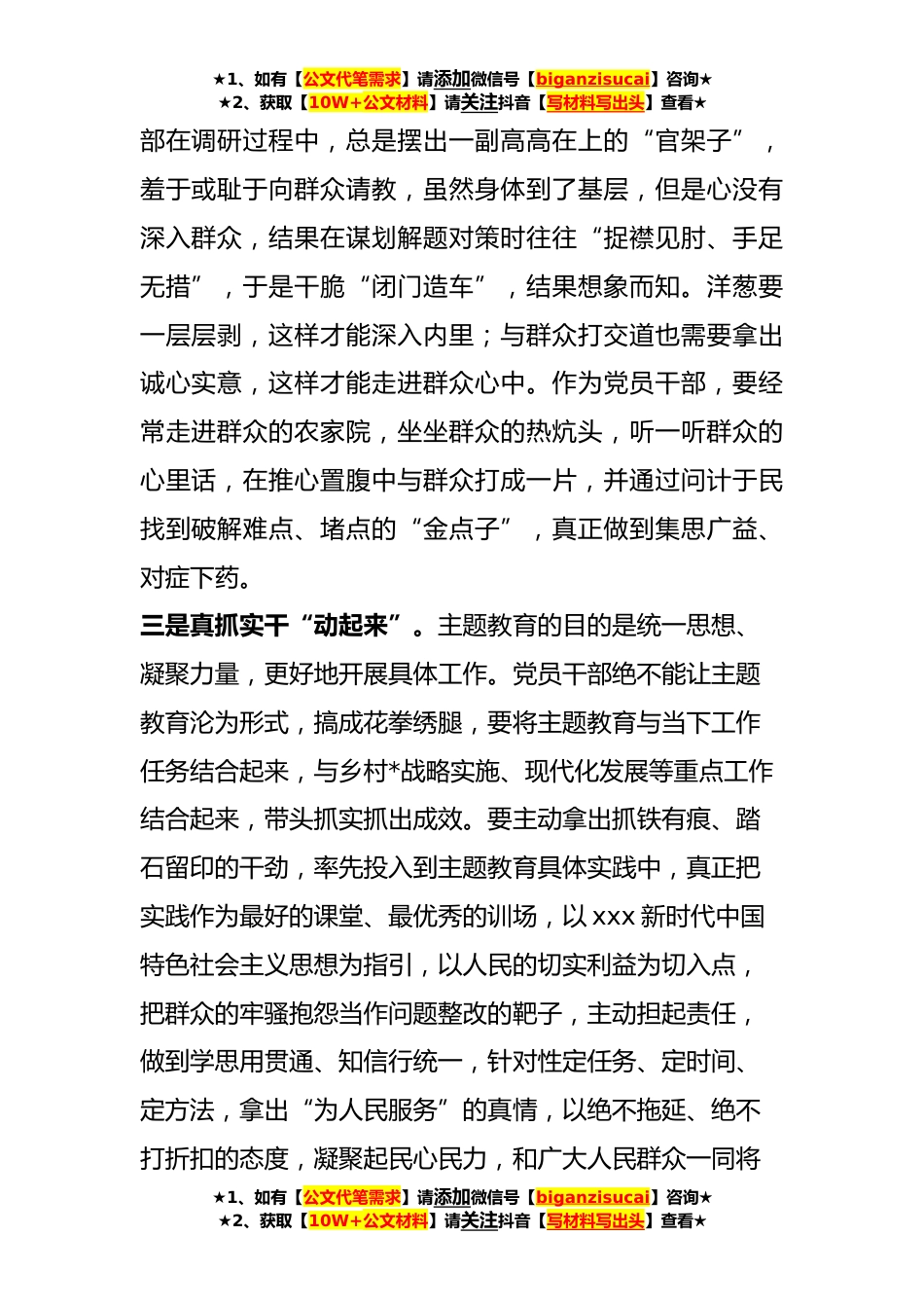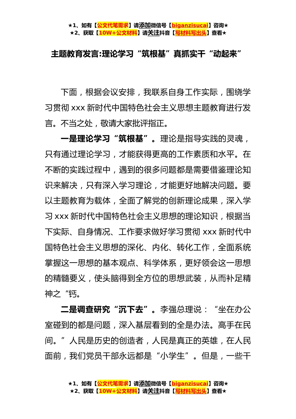 ★1、如有【公文代笔需求】请添加微信号【biganzisucai】咨询★★2、获取【10W+公文材料】请关注抖音【写材料写出头】查看★主题教育发言:理论学习“筑根基”真抓实干“动起来”下面,根据会议安排,我联系自身工作实际,围绕学习贯彻xxx新时代中国特色社会主义思想主题教育进行发言。不当之处,敬请大家批评指正。一是理论学习“筑根基”。理论是指导实践的灵魂,只有通过理论学习,才能获得更高的工作素质和水平。在不断的实践过程中,遇到的很多问题都是需要借鉴理论知识来解决,只有深入学习理论,才能更好地解决问题。要以主题教育为载体,全面了解党的创新理论成果,深入学习xxx新时代中国特色社会主义思想的理论知识,根据当下实际、自身情况、工作要求做好学习贯彻xxx新时代中国特色社会主义思想的深化、...