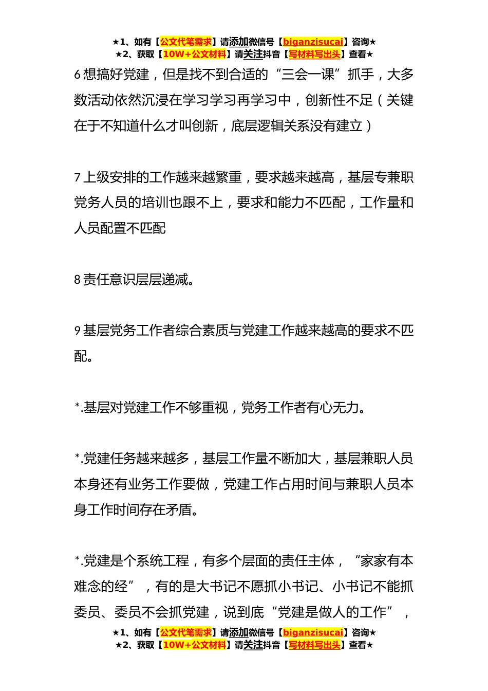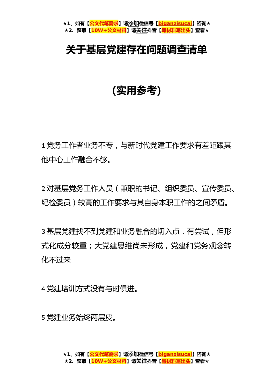 ★1、如有【公文代笔需求】请添加微信号【biganzisucai】咨询★★2、获取【10W+公文材料】请关注抖音【写材料写出头】查看★关于基层党建存在问题调查清单(实用参考)1党务工作者业务不专,与新时代党建工作要求有差距跟其他中心工作融合不够。2对基层党务工作人员(兼职的书记、组织委员、宣传委员、纪检委员)较高的工作要求与其自身本职工作的之间矛盾。3基层党建找不到党建和业务融合的切入点,有尝试,但形式化成分较重;大党建思维尚未形成,党建和党务观念转化不过来4党建培训方式没有与时俱进。5党建业务始终两层皮。★1、如有【公文代笔需求】请添加微信号【biganzisucai】咨询★★2、获取【10W+公文材料】请关注抖音【写材料写出头】查看★★1、如有【公文代笔需求】请添加微信号【biganzisucai】咨询...