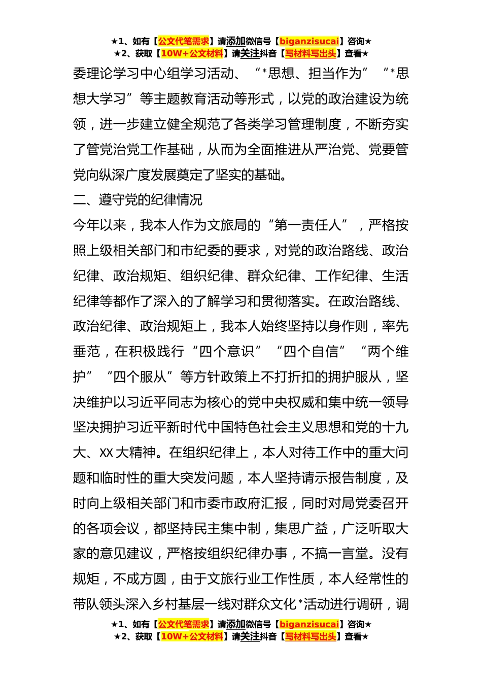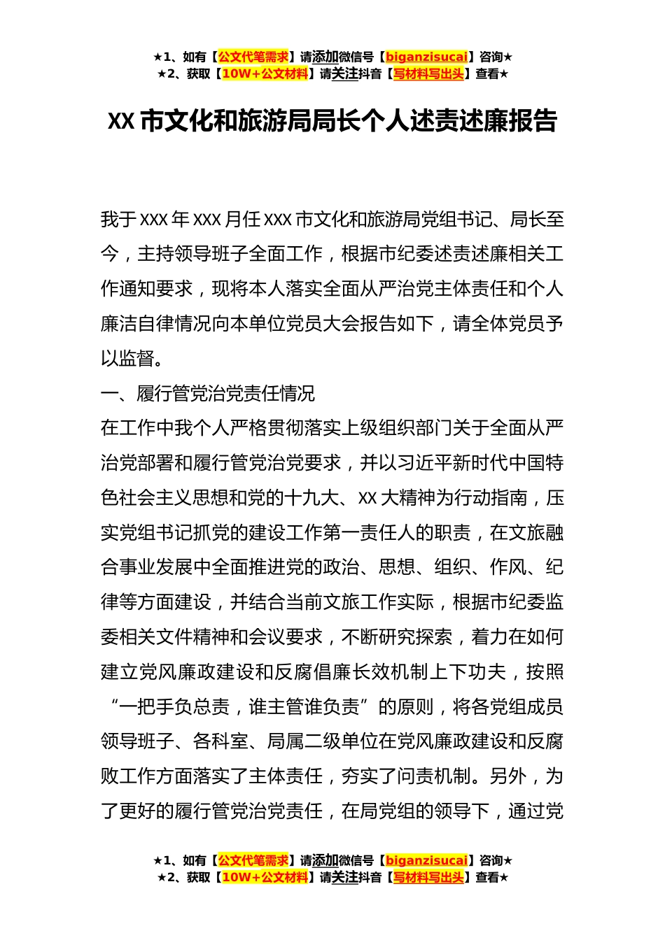 ★1、如有【公文代笔需求】请添加微信号【biganzisucai】咨询★★2、获取【10W+公文材料】请关注抖音【写材料写出头】查看★XX市文化和旅游局局长个人述责述廉报告我于XXX年XXX月任XXX市文化和旅游局党组书记、局长至今,主持领导班子全面工作,根据市纪委述责述廉相关工作通知要求,现将本人落实全面从严治党主体责任和个人廉洁自律情况向本单位党员大会报告如下,请全体党员予以监督。一、履行管党治党责任情况在工作中我个人严格贯彻落实上级组织部门关于全面从严治党部署和履行管党治党要求,并以习近平新时代中国特色社会主义思想和党的十九大、XX大精神为行动指南,压实党组书记抓党的建设工作第一责任人的职责,在文旅融合事业发展中全面推进党的政治、思想、组织、作风、纪律等方面建设,并结合当前文旅工...