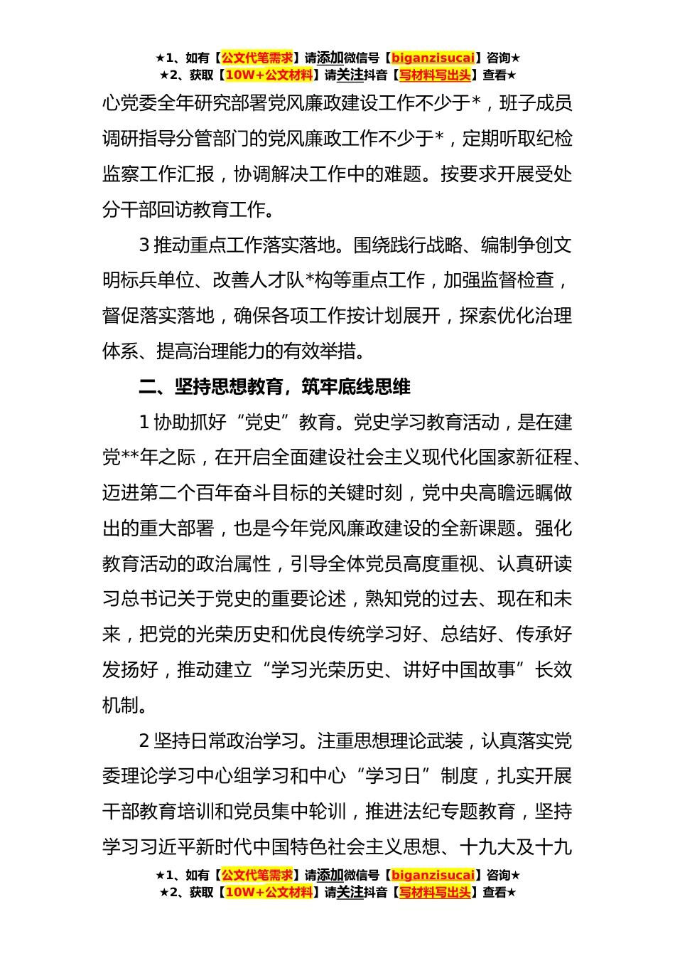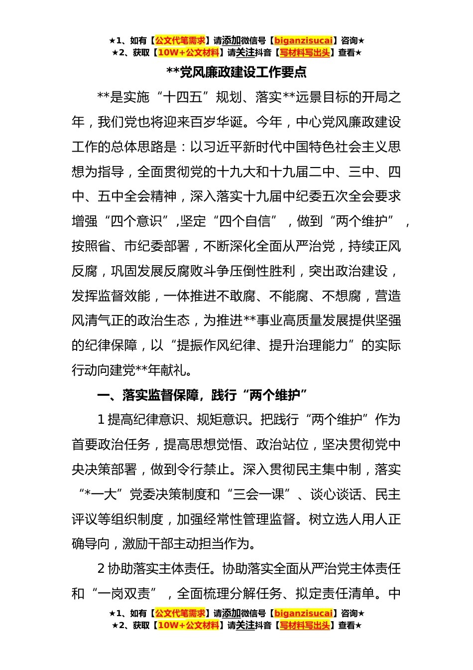 ★1、如有【公文代笔需求】请添加微信号【biganzisucai】咨询★★2、获取【10W+公文材料】请关注抖音【写材料写出头】查看★**党风廉政建设工作要点**是实施“十四五”规划、落实**远景目标的开局之年,我们党也将迎来百岁华诞。今年,中心党风廉政建设工作的总体思路是:以习近平新时代中国特色社会主义思想为指导,全面贯彻党的十九大和十九届二中、三中、四中、五中全会精神,深入落实十九届中纪委五次全会要求增强“四个意识”,坚定“四个自信”,做到“两个维护”,按照省、市纪委部署,不断深化全面从严治党,持续正风反腐,巩固发展反腐败斗争压倒性胜利,突出政治建设,发挥监督效能,一体推进不敢腐、不能腐、不想腐,营造风清气正的政治生态,为推进**事业高质量发展提供坚强的纪律保障,以“提振作风纪...