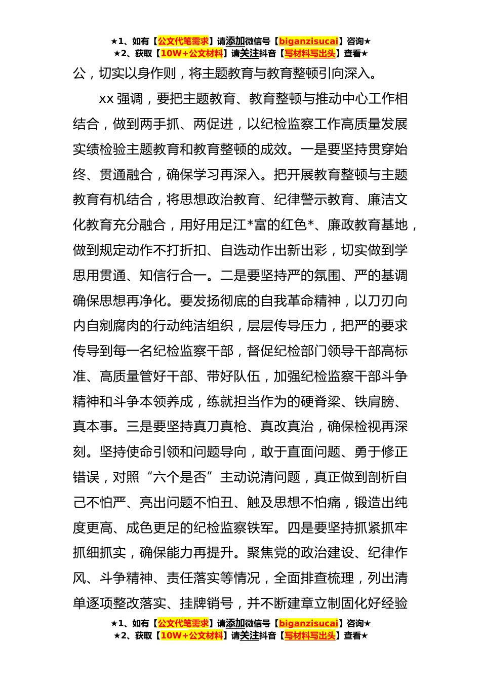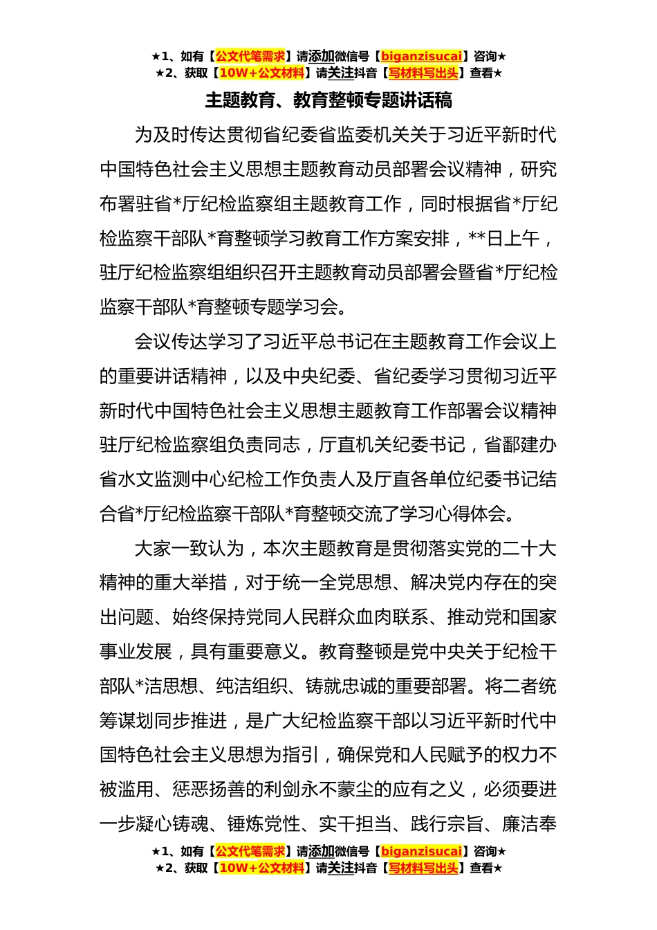★1、如有【公文代笔需求】请添加微信号【biganzisucai】咨询★★2、获取【10W+公文材料】请关注抖音【写材料写出头】查看★主题教育、教育整顿专题讲话稿为及时传达贯彻省纪委省监委机关关于习近平新时代中国特色社会主义思想主题教育动员部署会议精神,研究布署驻省*厅纪检监察组主题教育工作,同时根据省*厅纪检监察干部队*育整顿学习教育工作方案安排,**日上午,驻厅纪检监察组组织召开主题教育动员部署会暨省*厅纪检监察干部队*育整顿专题学习会。会议传达学习了习近平总书记在主题教育工作会议上的重要讲话精神,以及中央纪委、省纪委学习贯彻习近平新时代中国特色社会主义思想主题教育工作部署会议精神驻厅纪检监察组负责同志,厅直机关纪委书记,省鄱建办省水文监测中心纪检工作负责人及厅直各单位纪委书...