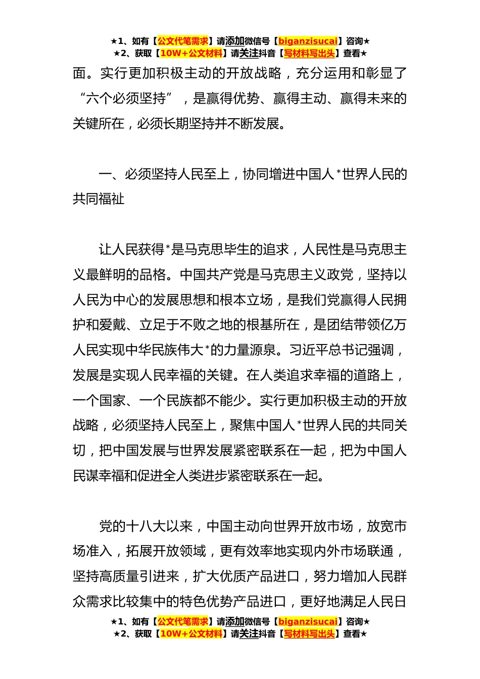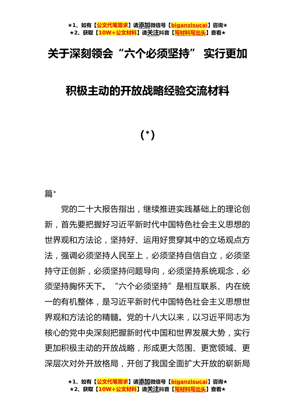 ★1、如有【公文代笔需求】请添加微信号【biganzisucai】咨询★★2、获取【10W+公文材料】请关注抖音【写材料写出头】查看★关于深刻领会“六个必须坚持”实行更加积极主动的开放战略经验交流材料(*)篇*党的二十大报告指出,继续推进实践基础上的理论创新,首先要把握好习近平新时代中国特色社会主义思想的世界观和方法论,坚持好、运用好贯穿其中的立场观点方法,强调必须坚持人民至上,必须坚持自信自立,必须坚持守正创新,必须坚持问题导向,必须坚持系统观念,必须坚持胸怀天下。“六个必须坚持”是相互联系、内在统一的有机整体,是习近平新时代中国特色社会主义思想世界观和方法论的精髓。党的十八大以来,以习近平同志为核心的党中央深刻把握新时代中国和世界发展大势,实行更加积极主动的开放战略,形...