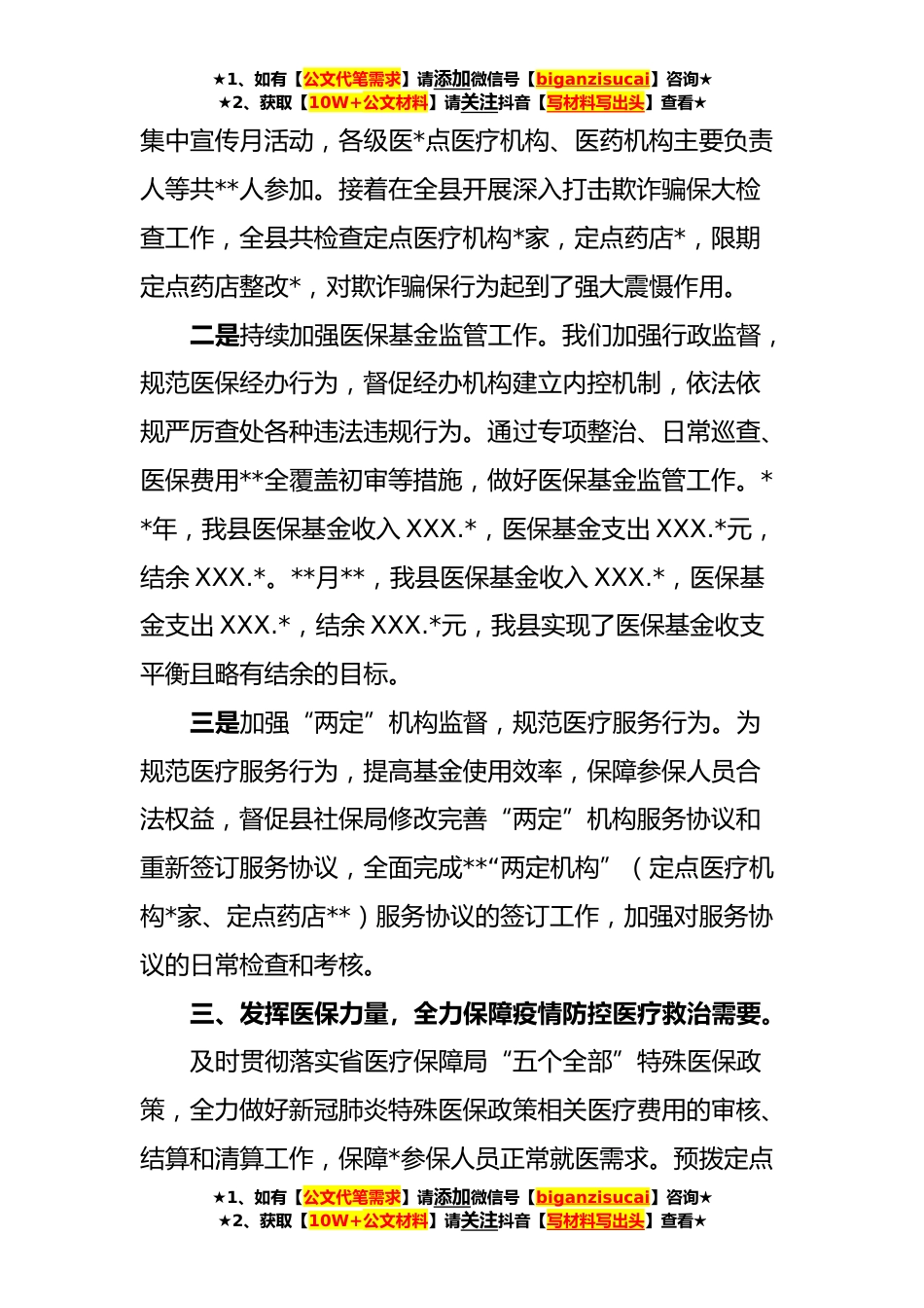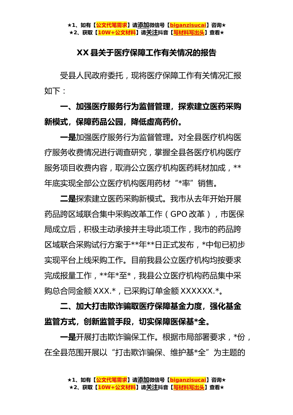 ★1、如有【公文代笔需求】请添加微信号【biganzisucai】咨询★★2、获取【10W+公文材料】请关注抖音【写材料写出头】查看★XX县关于医疗保障工作有关情况的报告受县人民政府委托,现将医疗保障工作有关情况汇报如下:一、加强医疗服务行为监督管理,探索建立医药采购新模式,保障药品公园,降低虚高药价。一是加强医疗服务行为监督管理。对全县医疗机构医疗服务收费情况进行调查研究,掌握全县各医疗机构医疗服务项目收费内容,取消公立医疗机构医药耗材加成,**年底实现全部公立医疗机构医用药材“*率”销售。二是探索建立医药采购新模式。我市从去年开始开展药品跨区域联合集中釆购改革工作(GPO改革),市医保局成立后,积极主动承接并主导此项工作,我市的药品跨区域联合采购试行方案于**年**日正式发布,*中...