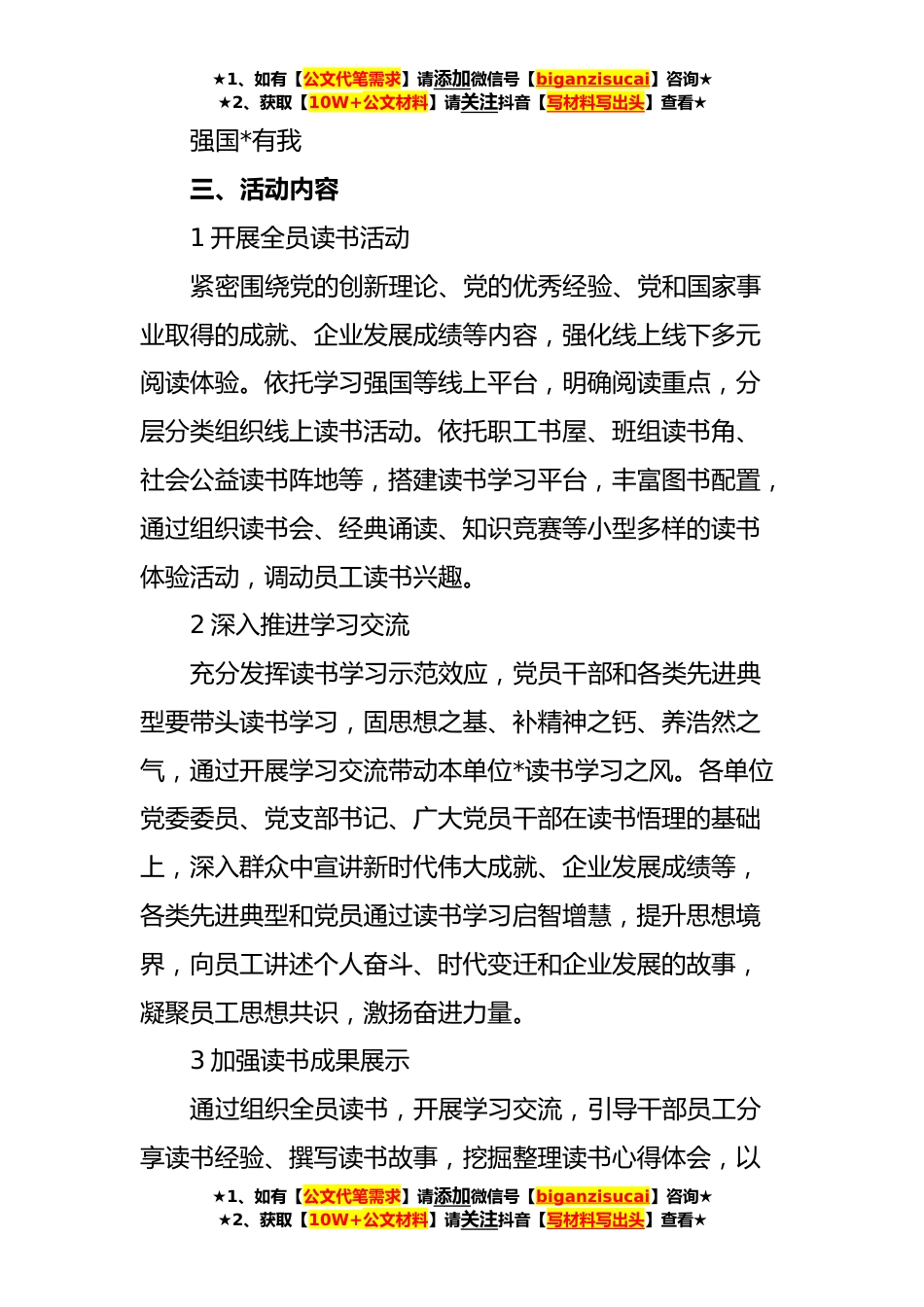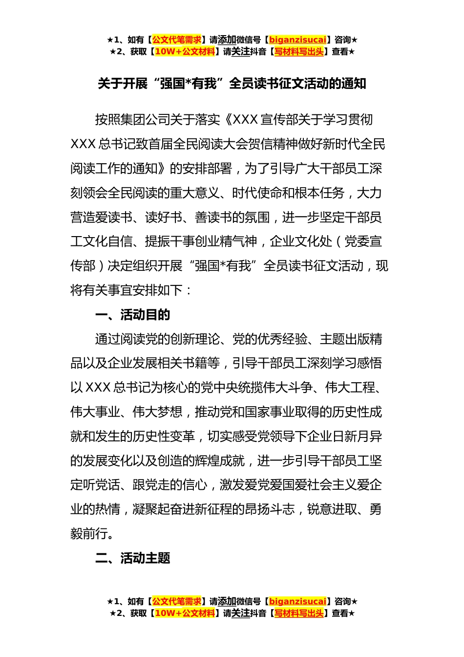 ★1、如有【公文代笔需求】请添加微信号【biganzisucai】咨询★★2、获取【10W+公文材料】请关注抖音【写材料写出头】查看★关于开展“强国*有我”全员读书征文活动的通知按照集团公司关于落实《XXX宣传部关于学习贯彻XXX总书记致首届全民阅读大会贺信精神做好新时代全民阅读工作的通知》的安排部署,为了引导广大干部员工深刻领会全民阅读的重大意义、时代使命和根本任务,大力营造爱读书、读好书、善读书的氛围,进一步坚定干部员工文化自信、提振干事创业精气神,企业文化处(党委宣传部)决定组织开展“强国*有我”全员读书征文活动,现将有关事宜安排如下:一、活动目的通过阅读党的创新理论、党的优秀经验、主题出版精品以及企业发展相关书籍等,引导干部员工深刻学习感悟以XXX总书记为核心的党中央统揽伟大...