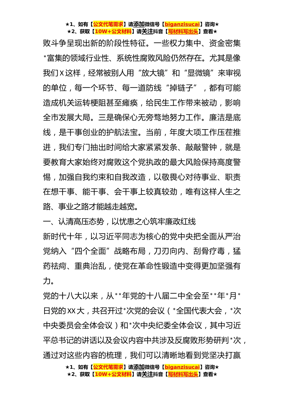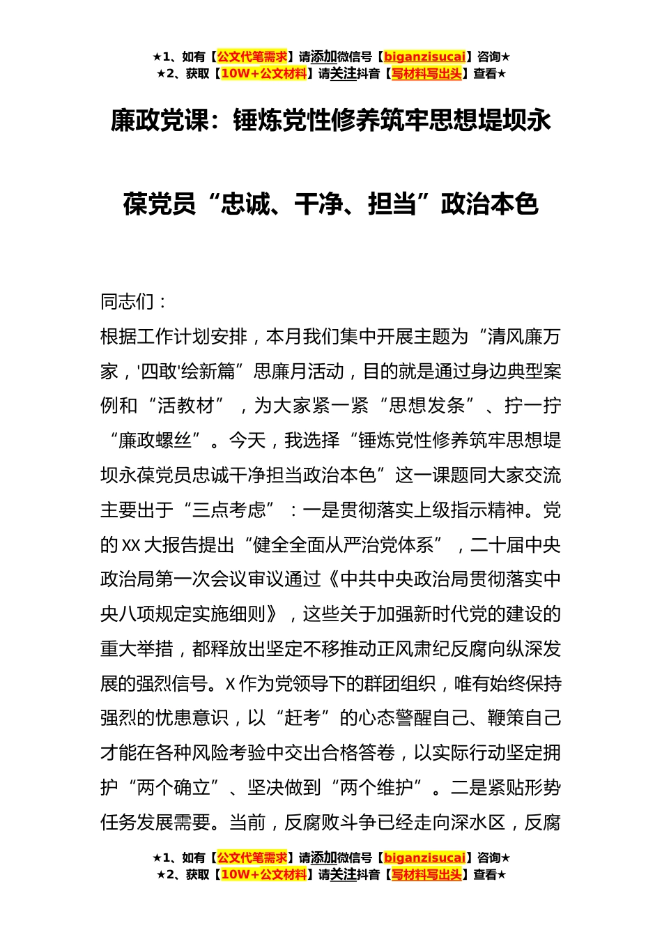 ★1、如有【公文代笔需求】请添加微信号【biganzisucai】咨询★★2、获取【10W+公文材料】请关注抖音【写材料写出头】查看★廉政党课:锤炼党性修养筑牢思想堤坝永葆党员“忠诚、干净、担当”政治本色同志们:根据工作计划安排,本月我们集中开展主题为“清风廉万家,'四敢'绘新篇”思廉月活动,目的就是通过身边典型案例和“活教材”,为大家紧一紧“思想发条”、拧一拧“廉政螺丝”。今天,我选择“锤炼党性修养筑牢思想堤坝永葆党员忠诚干净担当政治本色”这一课题同大家交流主要出于“三点考虑”:一是贯彻落实上级指示精神。党的XX大报告提出“健全全面从严治党体系”,二十届中央政治局第一次会议审议通过《中共中央政治局贯彻落实中央八项规定实施细则》,这些关于加强新时代党的建设的重大举措,都释放出...