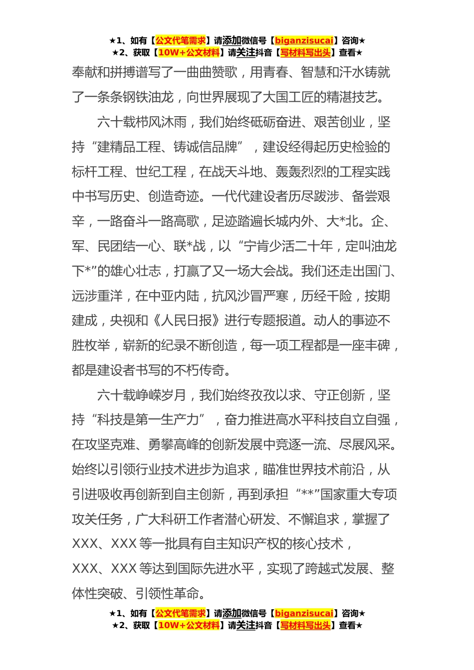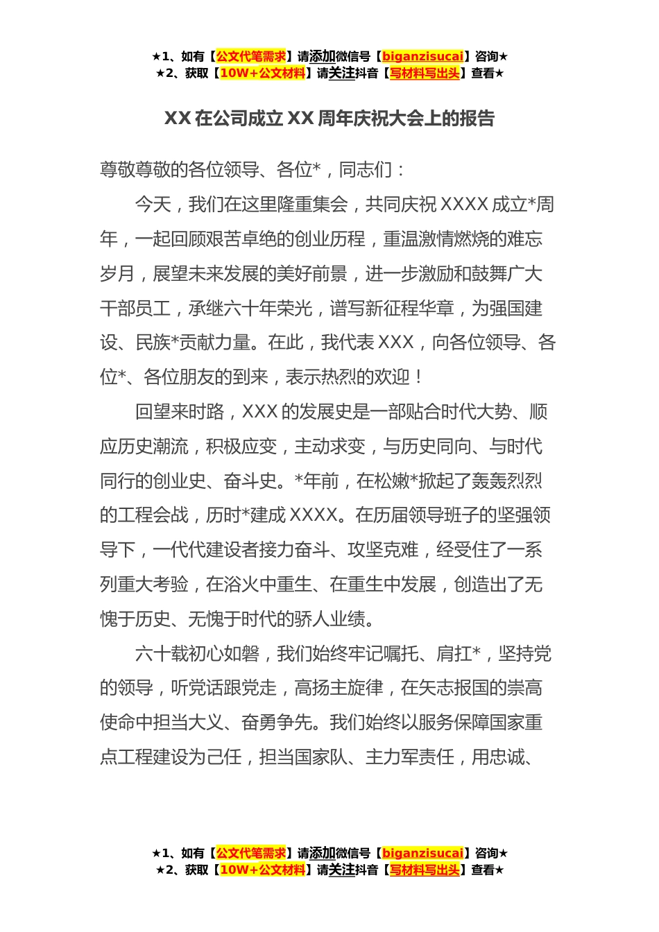 ★1、如有【公文代笔需求】请添加微信号【biganzisucai】咨询★★2、获取【10W+公文材料】请关注抖音【写材料写出头】查看★XX在公司成立XX周年庆祝大会上的报告尊敬尊敬的各位领导、各位*,同志们:今天,我们在这里隆重集会,共同庆祝XXXX成立*周年,一起回顾艰苦卓绝的创业历程,重温激情燃烧的难忘岁月,展望未来发展的美好前景,进一步激励和鼓舞广大干部员工,承继六十年荣光,谱写新征程华章,为强国建设、民族*贡献力量。在此,我代表XXX,向各位领导、各位*、各位朋友的到来,表示热烈的欢迎!回望来时路,XXX的发展史是一部贴合时代大势、顺应历史潮流,积极应变,主动求变,与历史同向、与时代同行的创业史、奋斗史。*年前,在松嫩*掀起了轰轰烈烈的工程会战,历时*建成XXXX。在历届领导班子的坚强领导...