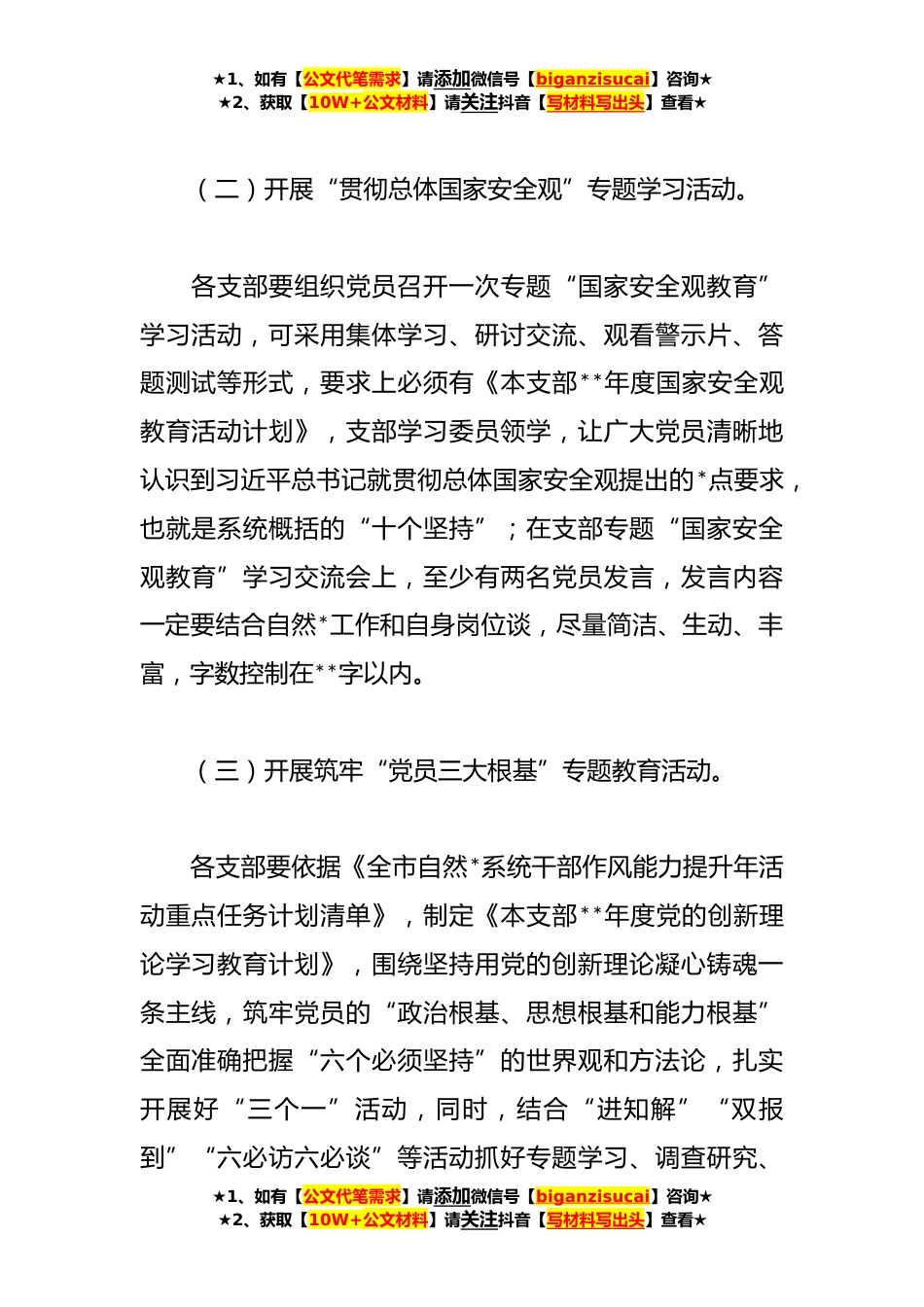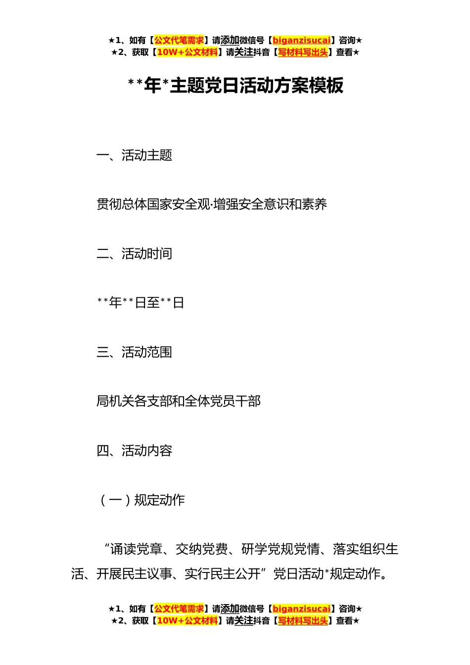 ★1、如有【公文代笔需求】请添加微信号【biganzisucai】咨询★★2、获取【10W+公文材料】请关注抖音【写材料写出头】查看★**年*主题党日活动方案模板一、活动主题贯彻总体国家安全观·增强安全意识和素养二、活动时间**年**日至**日三、活动范围局机关各支部和全体党员干部四、活动内容(一)规定动作“诵读党章、交纳党费、研学党规党情、落实组织生活、开展民主议事、实行民主公开”党日活动*规定动作。★1、如有【公文代笔需求】请添加微信号【biganzisucai】咨询★★2、获取【10W+公文材料】请关注抖音【写材料写出头】查看★★1、如有【公文代笔需求】请添加微信号【biganzisucai】咨询★★2、获取【10W+公文材料】请关注抖音【写材料写出头】查看★(二)开展“贯彻总体国家安全观”专题学习活动。各支部...
