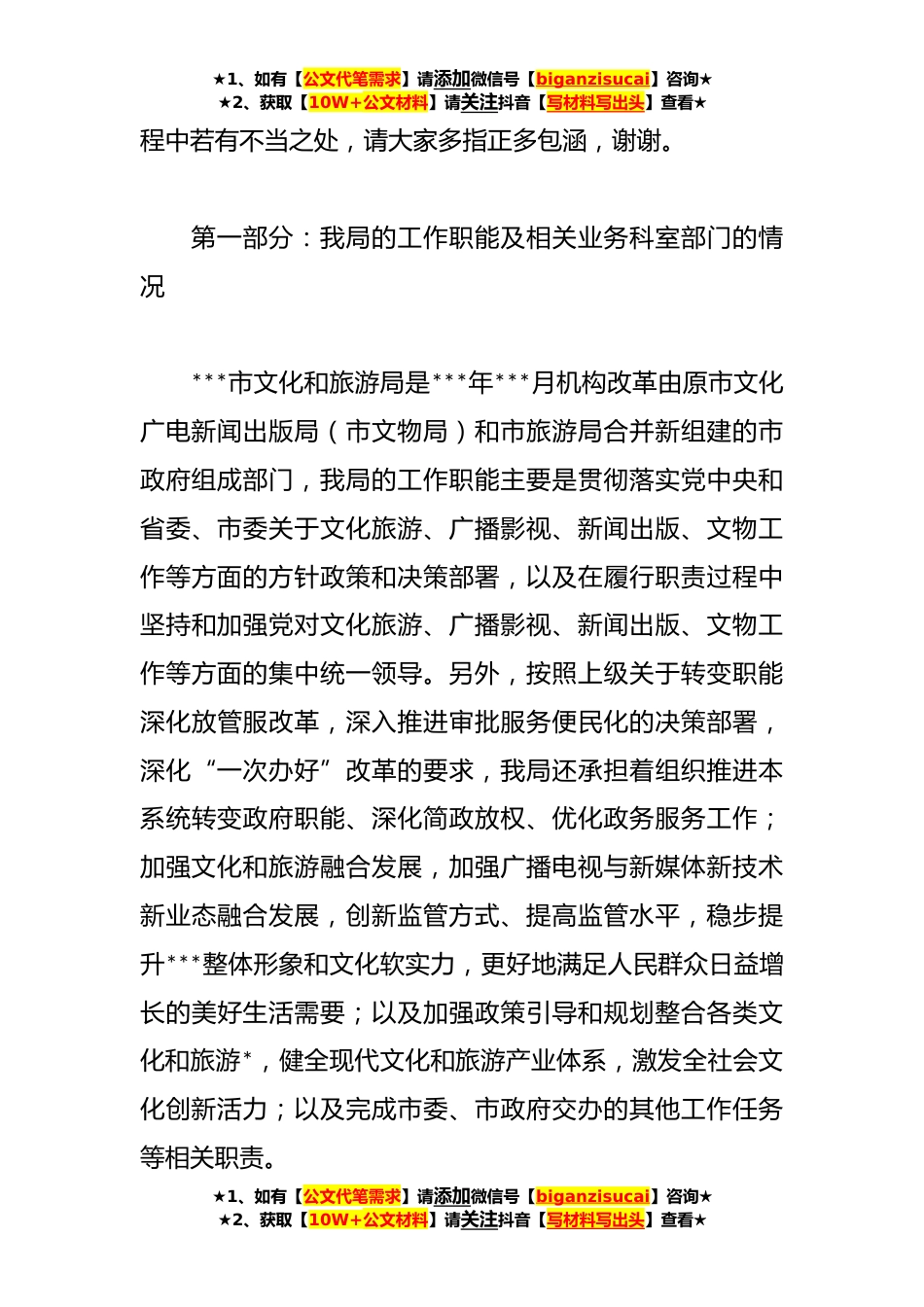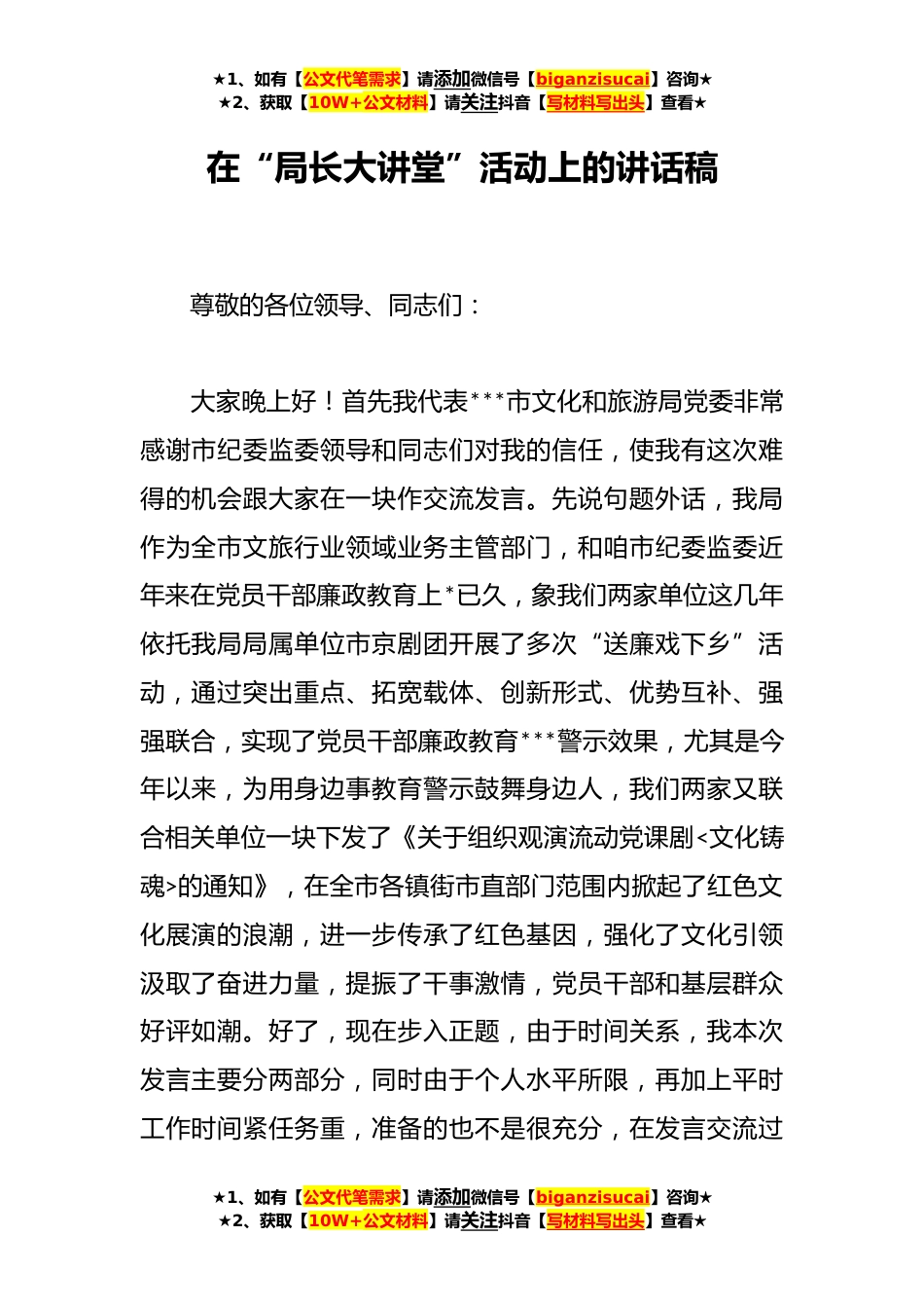 ★1、如有【公文代笔需求】请添加微信号【biganzisucai】咨询★★2、获取【10W+公文材料】请关注抖音【写材料写出头】查看★在“局长大讲堂”活动上的讲话稿尊敬的各位领导、同志们:大家晚上好!首先我代表***市文化和旅游局党委非常感谢市纪委监委领导和同志们对我的信任,使我有这次难得的机会跟大家在一块作交流发言。先说句题外话,我局作为全市文旅行业领域业务主管部门,和咱市纪委监委近年来在党员干部廉政教育上*已久,象我们两家单位这几年依托我局局属单位市京剧团开展了多次“送廉戏下乡”活动,通过突出重点、拓宽载体、创新形式、优势互补、强强联合,实现了党员干部廉政教育***警示效果,尤其是今年以来,为用身边事教育警示鼓舞身边人,我们两家又联合相关单位一块下发了《关于组织观演流动党课剧...