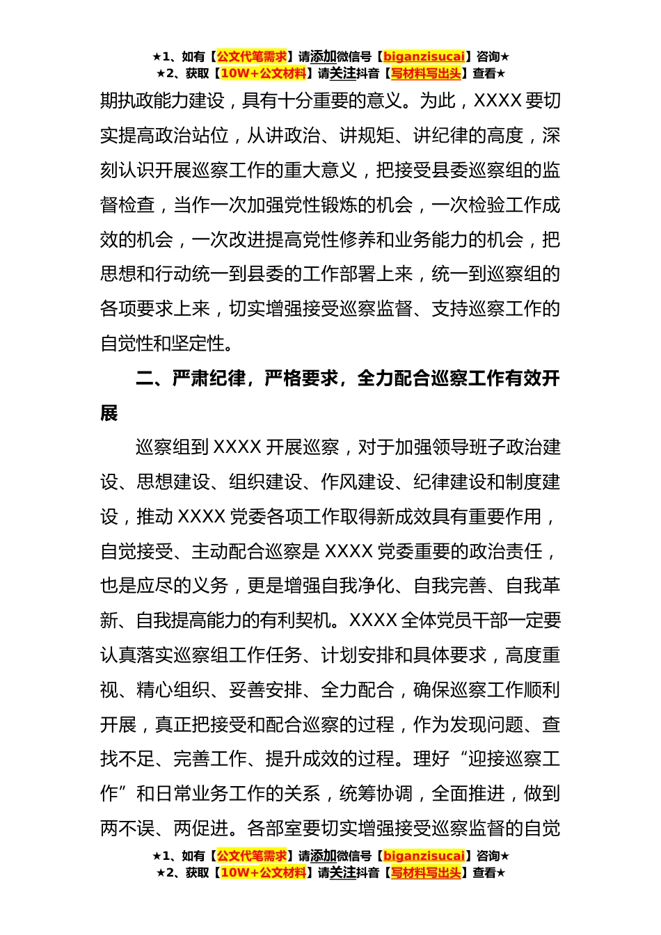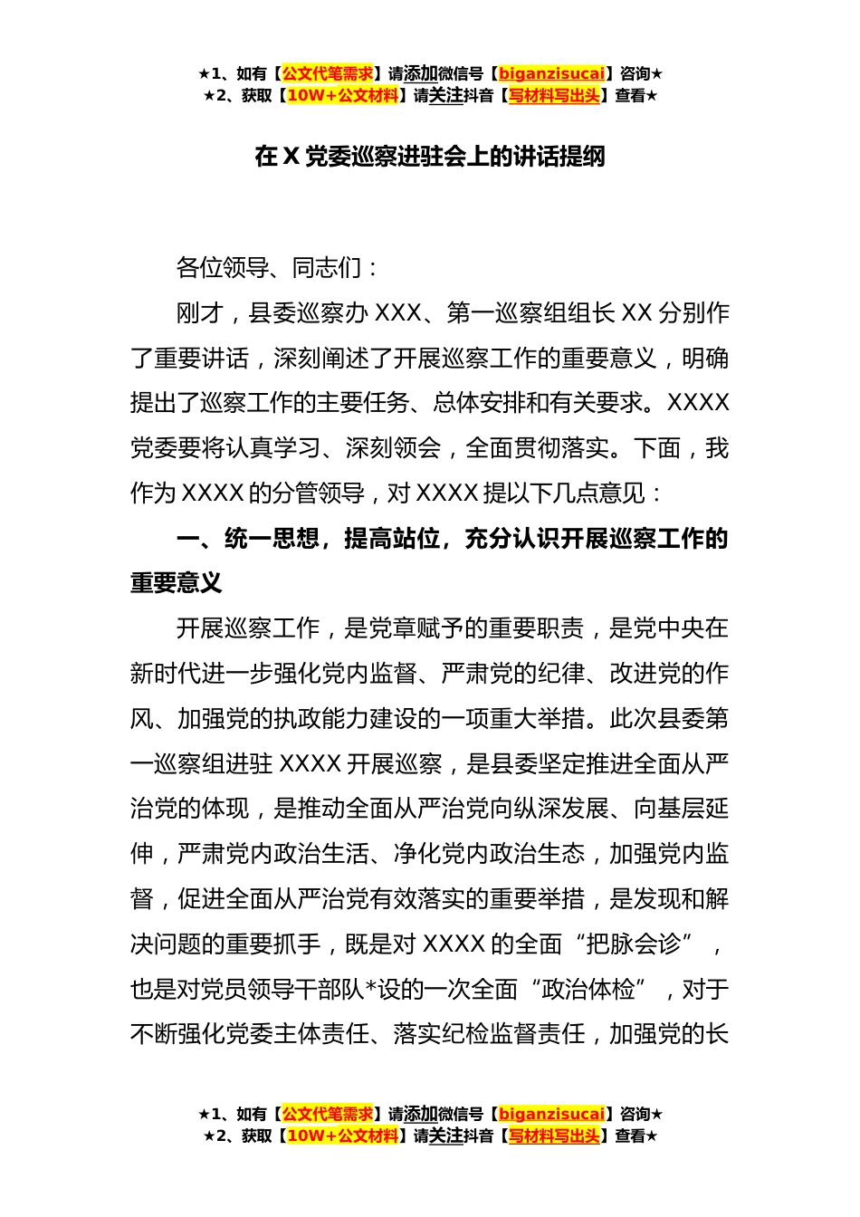 ★1、如有【公文代笔需求】请添加微信号【biganzisucai】咨询★★2、获取【10W+公文材料】请关注抖音【写材料写出头】查看★在X党委巡察进驻会上的讲话提纲各位领导、同志们:刚才,县委巡察办XXX、第一巡察组组长XX分别作了重要讲话,深刻阐述了开展巡察工作的重要意义,明确提出了巡察工作的主要任务、总体安排和有关要求。XXXX党委要将认真学习、深刻领会,全面贯彻落实。下面,我作为XXXX的分管领导,对XXXX提以下几点意见:一、统一思想,提高站位,充分认识开展巡察工作的重要意义开展巡察工作,是党章赋予的重要职责,是党中央在新时代进一步强化党内监督、严肃党的纪律、改进党的作风、加强党的执政能力建设的一项重大举措。此次县委第一巡察组进驻XXXX开展巡察,是县委坚定推进全面从严治党的体现,是推...
