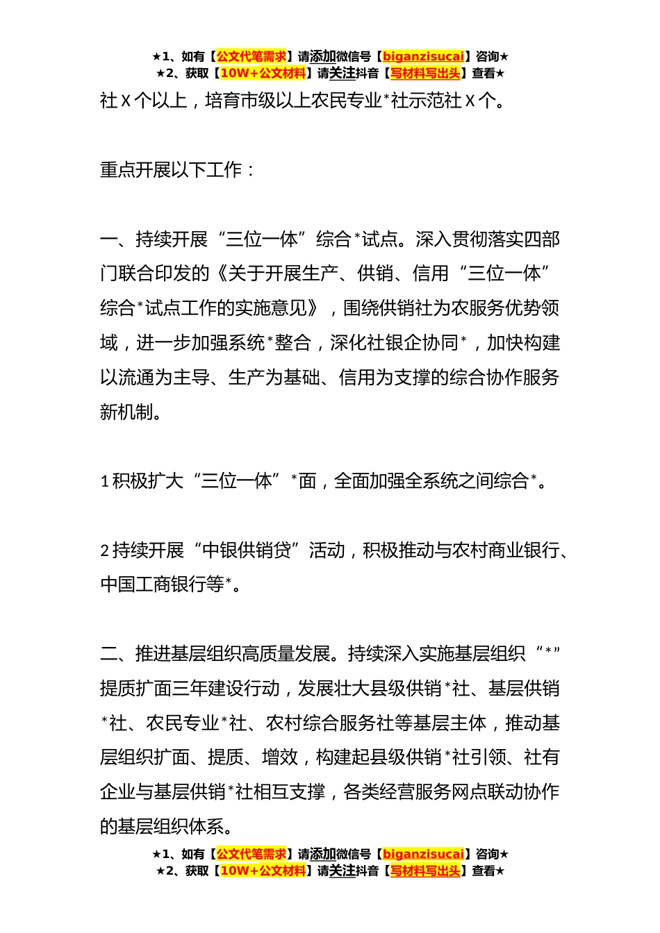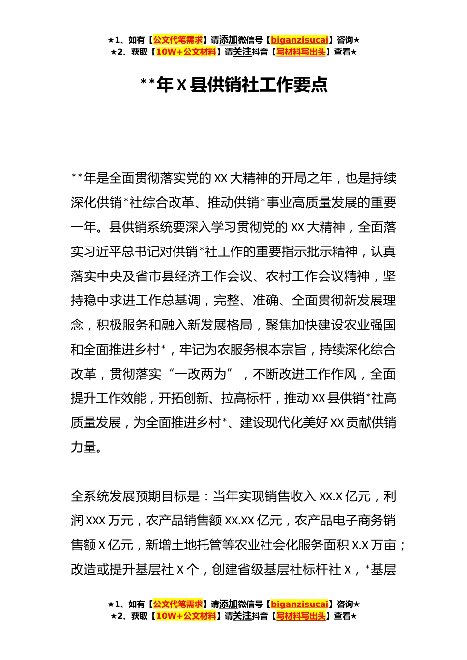 ★1、如有【公文代笔需求】请添加微信号【biganzisucai】咨询★★2、获取【10W+公文材料】请关注抖音【写材料写出头】查看★**年X县供销社工作要点**年是全面贯彻落实党的XX大精神的开局之年,也是持续深化供销*社综合改革、推动供销*事业高质量发展的重要一年。县供销系统要深入学习贯彻党的XX大精神,全面落实习近平总书记对供销*社工作的重要指示批示精神,认真落实中央及省市县经济工作会议、农村工作会议精神,坚持稳中求进工作总基调,完整、准确、全面贯彻新发展理念,积极服务和融入新发展格局,聚焦加快建设农业强国和全面推进乡村*,牢记为农服务根本宗旨,持续深化综合改革,贯彻落实“一改两为”,不断改进工作作风,全面提升工作效能,开拓创新、拉高标杆,推动XX县供销*社高质量发展,为全面推进乡...