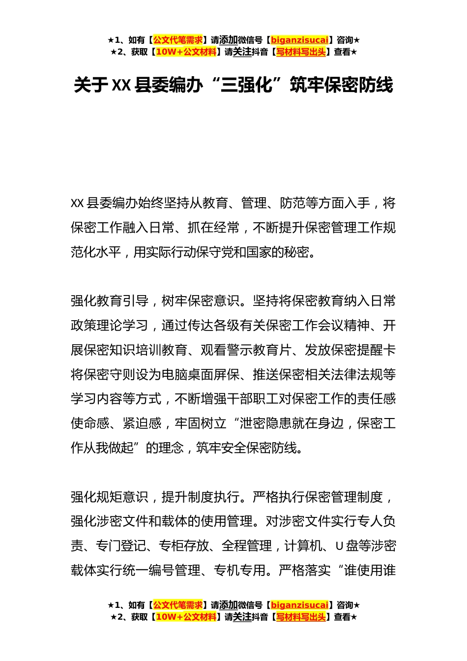 ★1、如有【公文代笔需求】请添加微信号【biganzisucai】咨询★★2、获取【10W+公文材料】请关注抖音【写材料写出头】查看★关于XX县委编办“三强化”筑牢保密防线XX县委编办始终坚持从教育、管理、防范等方面入手,将保密工作融入日常、抓在经常,不断提升保密管理工作规范化水平,用实际行动保守党和国家的秘密。强化教育引导,树牢保密意识。坚持将保密教育纳入日常政策理论学习,通过传达各级有关保密工作会议精神、开展保密知识培训教育、观看警示教育片、发放保密提醒卡将保密守则设为电脑桌面屏保、推送保密相关法律法规等学习内容等方式,不断增强干部职工对保密工作的责任感使命感、紧迫感,牢固树立“泄密隐患就在身边,保密工作从我做起”的理念,筑牢安全保密防线。强化规矩意识,提升制度执行。严格...