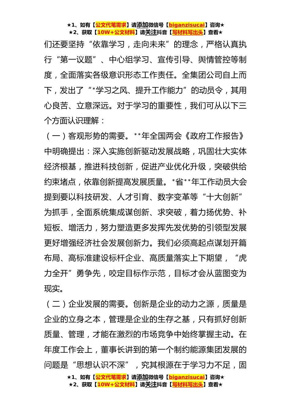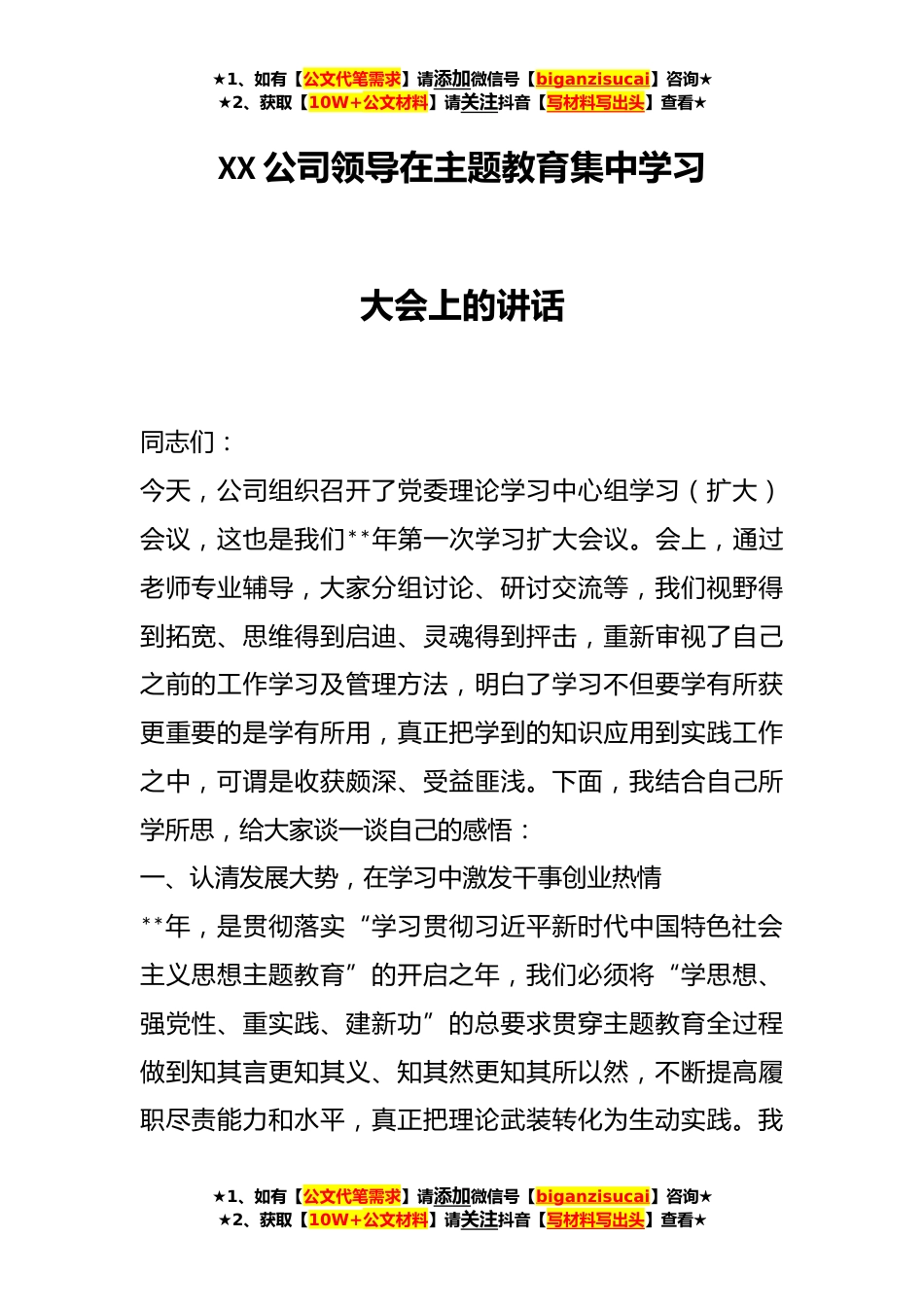 ★1、如有【公文代笔需求】请添加微信号【biganzisucai】咨询★★2、获取【10W+公文材料】请关注抖音【写材料写出头】查看★XX公司领导在主题教育集中学习大会上的讲话同志们:今天,公司组织召开了党委理论学习中心组学习(扩大)会议,这也是我们**年第一次学习扩大会议。会上,通过老师专业辅导,大家分组讨论、研讨交流等,我们视野得到拓宽、思维得到启迪、灵魂得到抨击,重新审视了自己之前的工作学习及管理方法,明白了学习不但要学有所获更重要的是学有所用,真正把学到的知识应用到实践工作之中,可谓是收获颇深、受益匪浅。下面,我结合自己所学所思,给大家谈一谈自己的感悟:一、认清发展大势,在学习中激发干事创业热情**年,是贯彻落实“学习贯彻习近平新时代中国特色社会主义思想主题教育”的开启...
