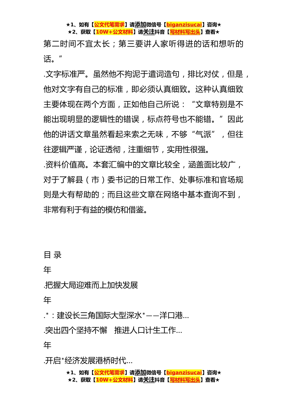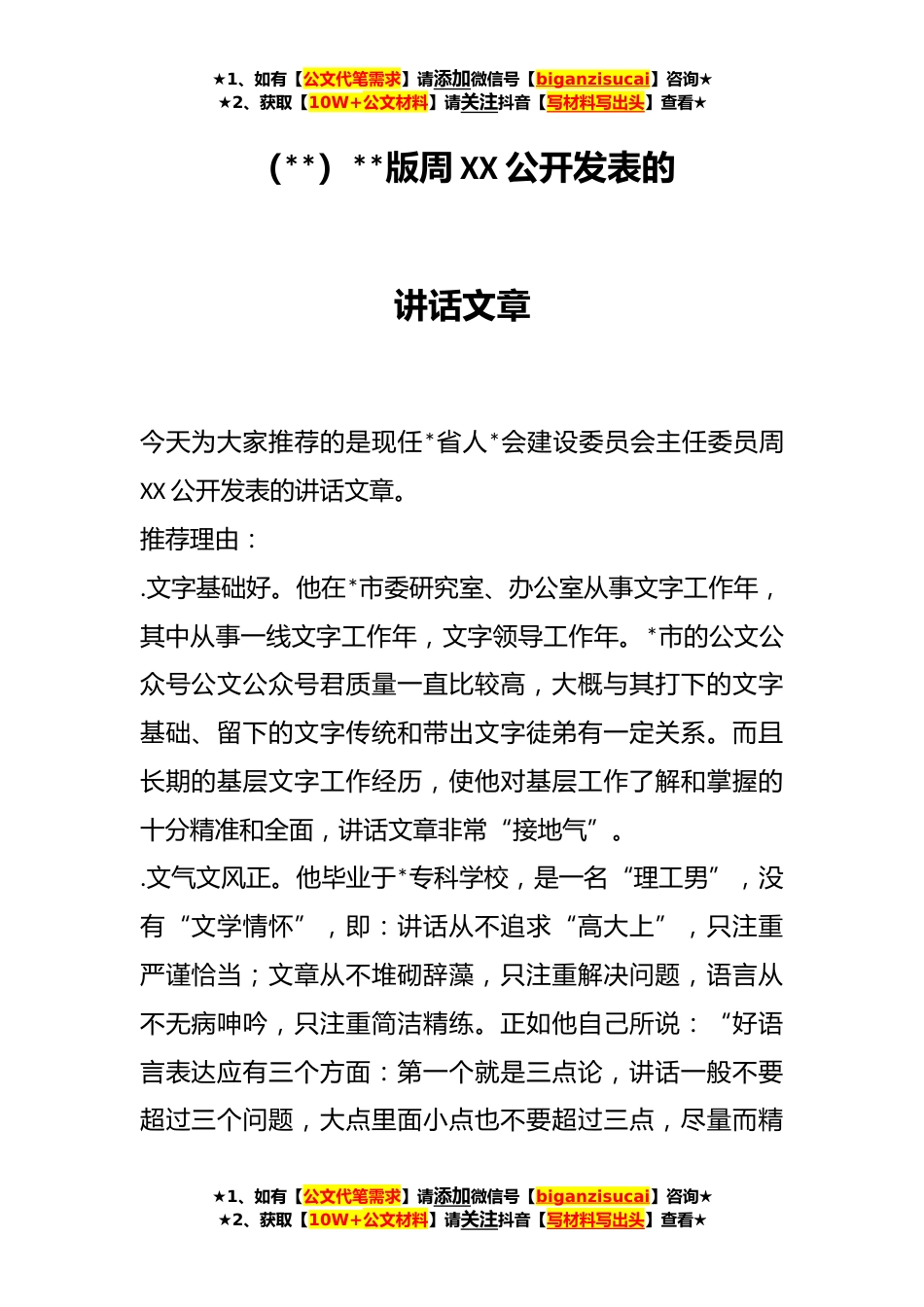 ★1、如有【公文代笔需求】请添加微信号【biganzisucai】咨询★★2、获取【10W+公文材料】请关注抖音【写材料写出头】查看★(**)**版周XX公开发表的讲话文章今天为大家推荐的是现任*省人*会建设委员会主任委员周XX公开发表的讲话文章。推荐理由:.文字基础好。他在*市委研究室、办公室从事文字工作年,其中从事一线文字工作年,文字领导工作年。*市的公文公众号公文公众号君质量一直比较高,大概与其打下的文字基础、留下的文字传统和带出文字徒弟有一定关系。而且长期的基层文字工作经历,使他对基层工作了解和掌握的十分精准和全面,讲话文章非常“接地气”。.文气文风正。他毕业于*专科学校,是一名“理工男”,没有“文学情怀”,即:讲话从不追求“高大上”,只注重严谨恰当;文章从不堆砌辞藻,只注重解决...