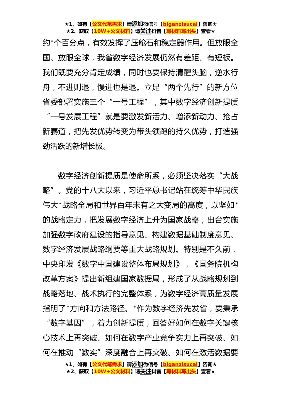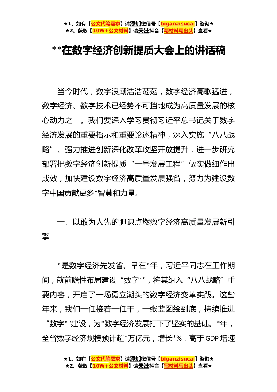 ★1、如有【公文代笔需求】请添加微信号【biganzisucai】咨询★★2、获取【10W+公文材料】请关注抖音【写材料写出头】查看★**在数字经济创新提质大会上的讲话稿当今时代,数字浪潮浩浩荡荡,数字经济高歌猛进,数字经济、数字技术已经势不可挡地成为高质量发展的核心动力之一。我们要深入学习贯彻习近平总书记关于数字经济发展的重要指示和重要论述精神,深入实施“八八战略”、强力推进创新深化改革攻坚开放提升,进一步研究部署把数字经济创新提质“一号发展工程”做实做细作出成效,加快建设数字经济高质量发展强省,努力为建设数字中国贡献更多*智慧和力量。一、以敢为人先的胆识点燃数字经济高质量发展新引擎*是数字经济先发省。早在*年,习近平同志在工作期间,就前瞻性布局建设“数字*”,将其纳入“八八...