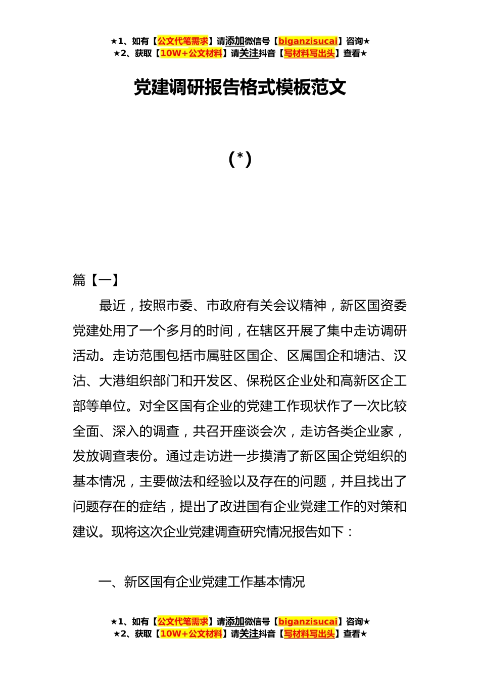 ★1、如有【公文代笔需求】请添加微信号【biganzisucai】咨询★★2、获取【10W+公文材料】请关注抖音【写材料写出头】查看★党建调研报告格式模板范文(*)篇【一】最近,按照市委、市政府有关会议精神,新区国资委党建处用了一个多月的时间,在辖区开展了集中走访调研活动。走访范围包括市属驻区国企、区属国企和塘沽、汉沽、大港组织部门和开发区、保税区企业处和高新区企工部等单位。对全区国有企业的党建工作现状作了一次比较全面、深入的调查,共召开座谈会次,走访各类企业家,发放调查表份。通过走访进一步摸清了新区国企党组织的基本情况,主要做法和经验以及存在的问题,并且找出了问题存在的症结,提出了改进国有企业党建工作的对策和建议。现将这次企业党建调查研究情况报告如下:一、新区国有企业党建...
