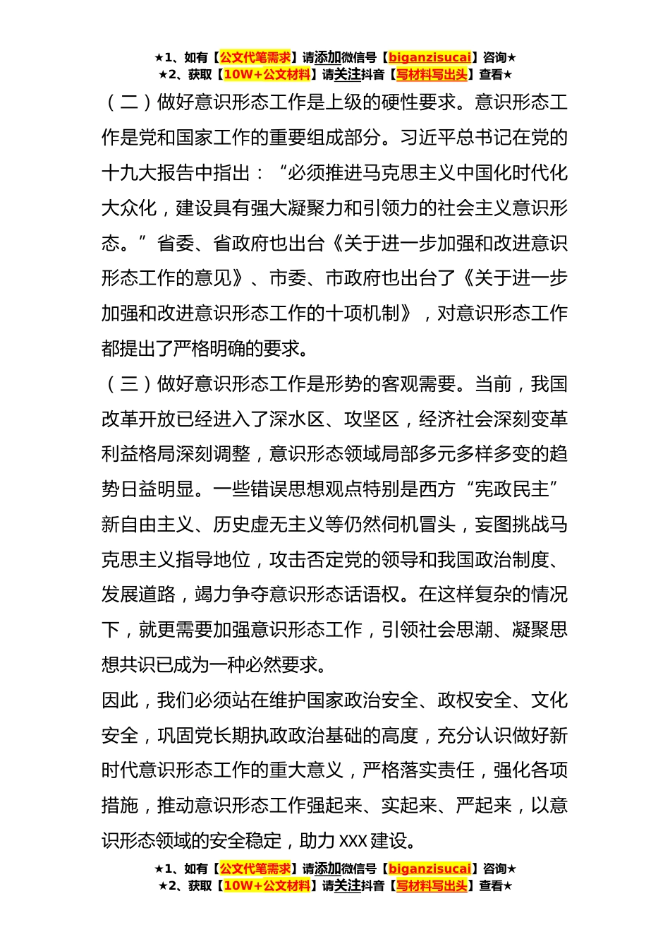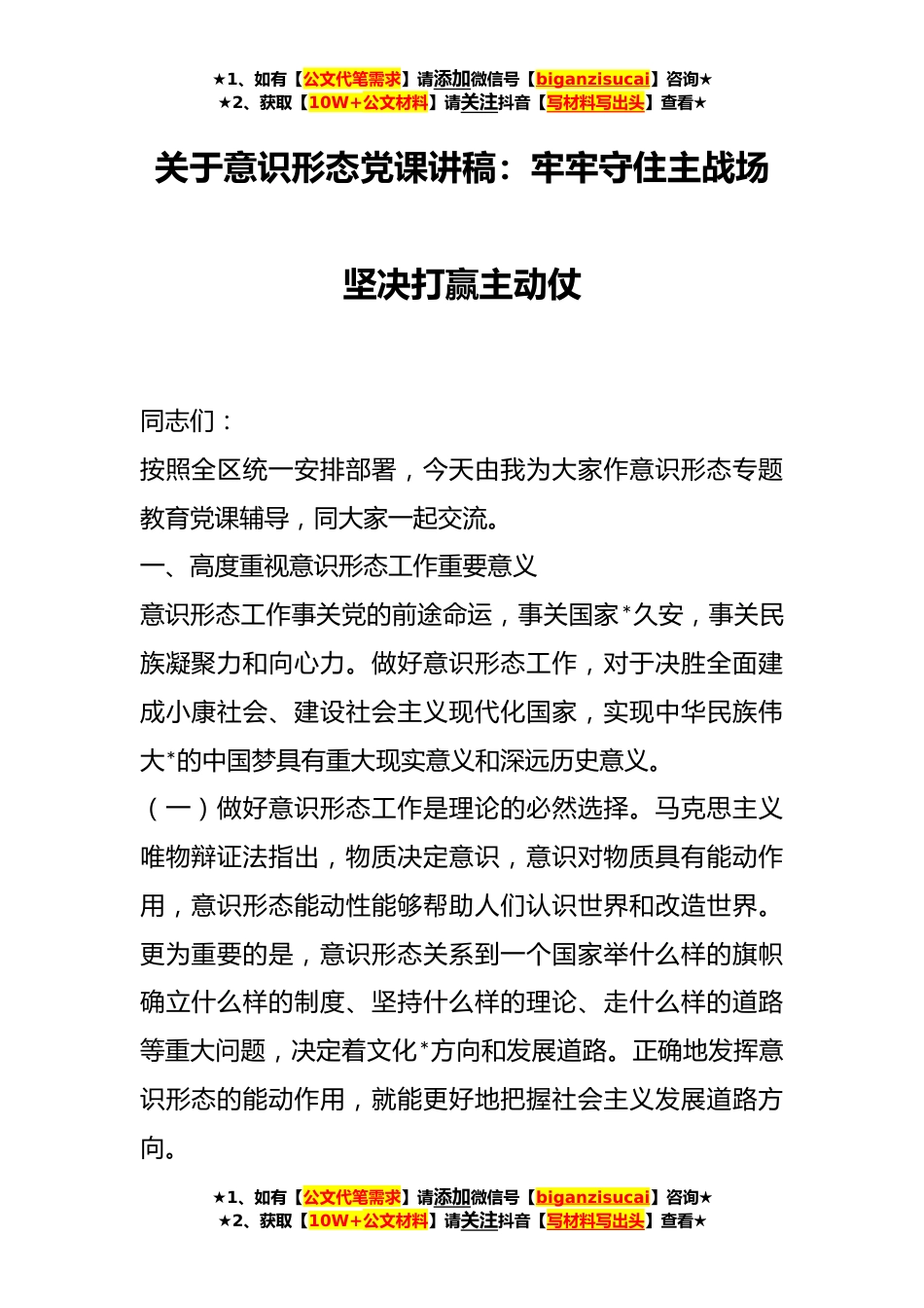 ★1、如有【公文代笔需求】请添加微信号【biganzisucai】咨询★★2、获取【10W+公文材料】请关注抖音【写材料写出头】查看★关于意识形态党课讲稿:牢牢守住主战场坚决打赢主动仗同志们:按照全区统一安排部署,今天由我为大家作意识形态专题教育党课辅导,同大家一起交流。一、高度重视意识形态工作重要意义意识形态工作事关党的前途命运,事关国家*久安,事关民族凝聚力和向心力。做好意识形态工作,对于决胜全面建成小康社会、建设社会主义现代化国家,实现中华民族伟大*的中国梦具有重大现实意义和深远历史意义。(一)做好意识形态工作是理论的必然选择。马克思主义唯物辩证法指出,物质决定意识,意识对物质具有能动作用,意识形态能动性能够帮助人们认识世界和改造世界。更为重要的是,意识形态关系到一个...
