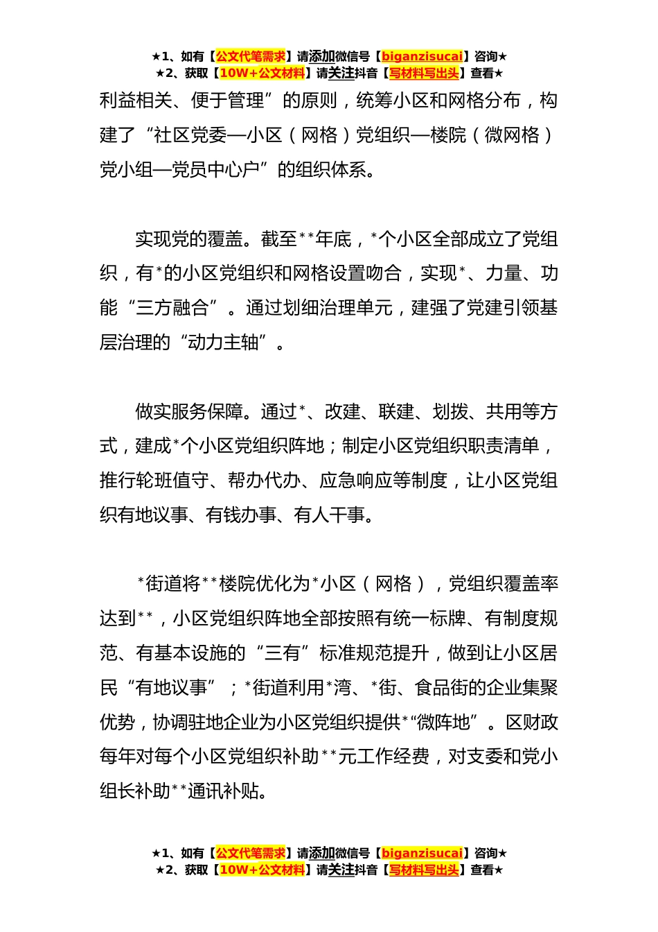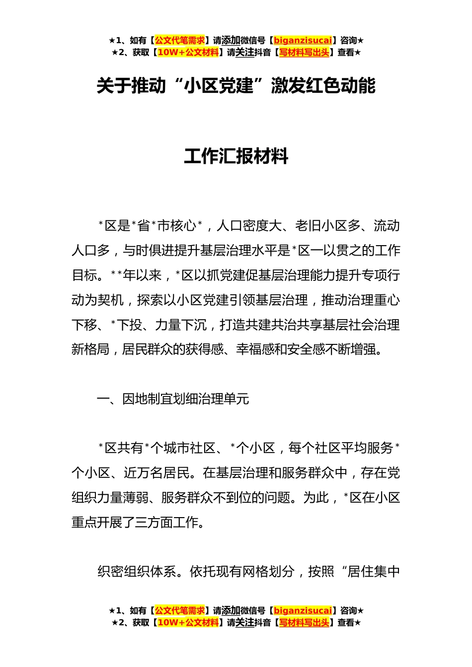 ★1、如有【公文代笔需求】请添加微信号【biganzisucai】咨询★★2、获取【10W+公文材料】请关注抖音【写材料写出头】查看★关于推动“小区党建”激发红色动能工作汇报材料*区是*省*市核心*,人口密度大、老旧小区多、流动人口多,与时俱进提升基层治理水平是*区一以贯之的工作目标。**年以来,*区以抓党建促基层治理能力提升专项行动为契机,探索以小区党建引领基层治理,推动治理重心下移、*下投、力量下沉,打造共建共治共享基层社会治理新格局,居民群众的获得感、幸福感和安全感不断增强。一、因地制宜划细治理单元*区共有*个城市社区、*个小区,每个社区平均服务*个小区、近万名居民。在基层治理和服务群众中,存在党组织力量薄弱、服务群众不到位的问题。为此,*区在小区重点开展了三方面工作。织密组织体...