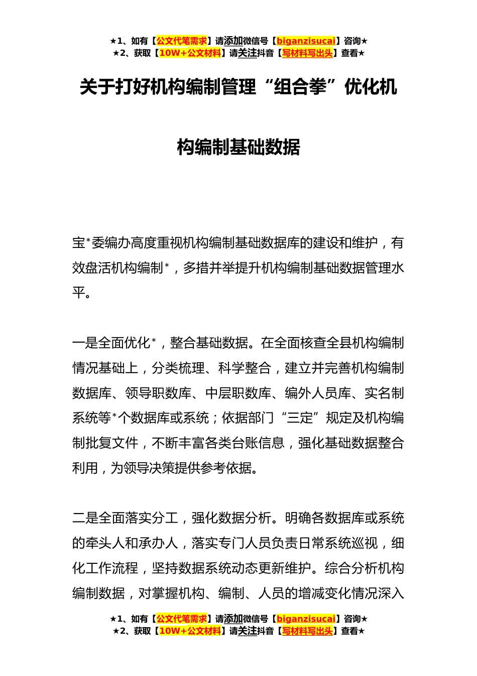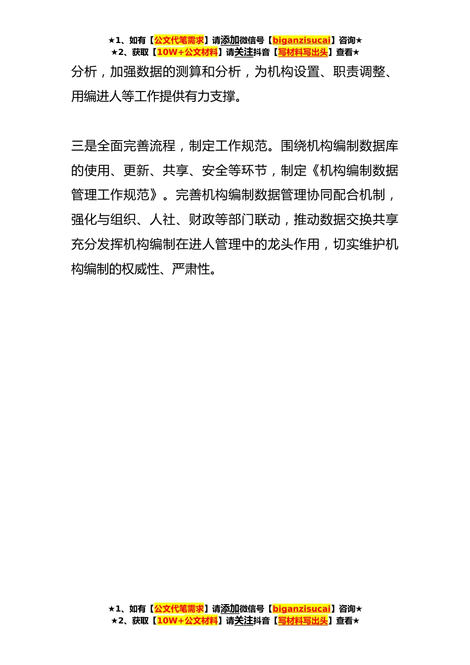 ★1、如有【公文代笔需求】请添加微信号【biganzisucai】咨询★★2、获取【10W+公文材料】请关注抖音【写材料写出头】查看★关于打好机构编制管理“组合拳”优化机构编制基础数据宝*委编办高度重视机构编制基础数据库的建设和维护,有效盘活机构编制*,多措并举提升机构编制基础数据管理水平。一是全面优化*,整合基础数据。在全面核查全县机构编制情况基础上,分类梳理、科学整合,建立并完善机构编制数据库、领导职数库、中层职数库、编外人员库、实名制系统等*个数据库或系统;依据部门“三定”规定及机构编制批复文件,不断丰富各类台账信息,强化基础数据整合利用,为领导决策提供参考依据。二是全面落实分工,强化数据分析。明确各数据库或系统的牵头人和承办人,落实专门人员负责日常系统巡视,细化工作流...