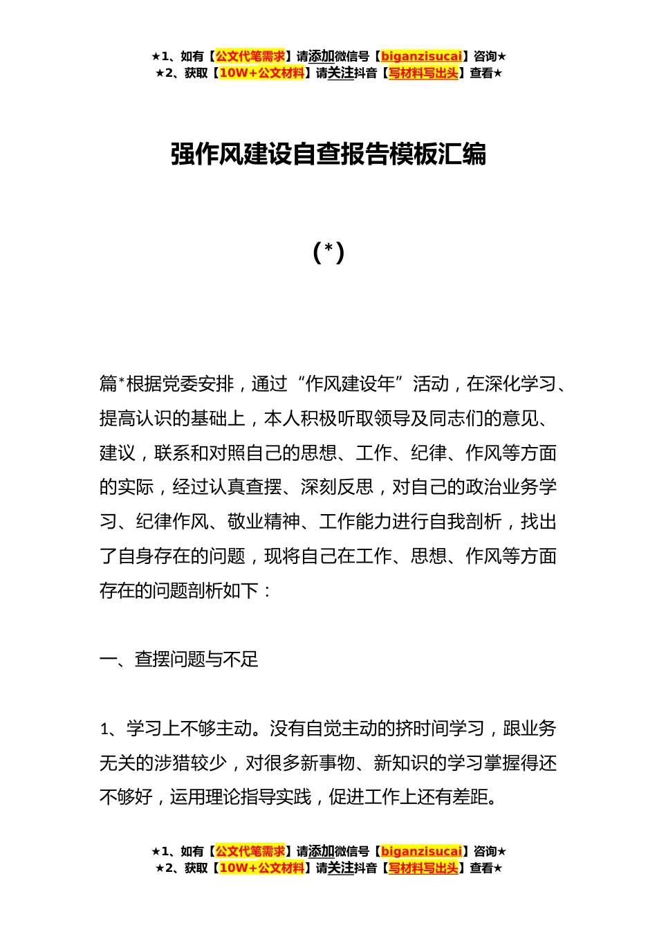 ★1、如有【公文代笔需求】请添加微信号【biganzisucai】咨询★★2、获取【10W+公文材料】请关注抖音【写材料写出头】查看★强作风建设自查报告模板汇编(*)篇*根据党委安排,通过“作风建设年”活动,在深化学习、提高认识的基础上,本人积极听取领导及同志们的意见、建议,联系和对照自己的思想、工作、纪律、作风等方面的实际,经过认真查摆、深刻反思,对自己的政治业务学习、纪律作风、敬业精神、工作能力进行自我剖析,找出了自身存在的问题,现将自己在工作、思想、作风等方面存在的问题剖析如下:一、查摆问题与不足1、学习上不够主动。没有自觉主动的挤时间学习,跟业务无关的涉猎较少,对很多新事物、新知识的学习掌握得还不够好,运用理论指导实践,促进工作上还有差距。★1、如有【公文代笔需求】请...