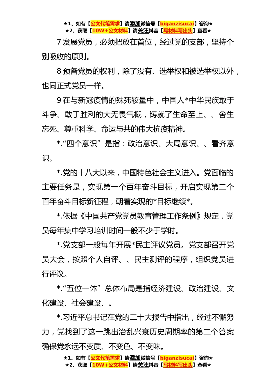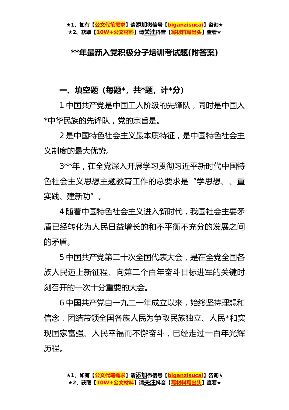★1、如有【公文代笔需求】请添加微信号【biganzisucai】咨询★★2、获取【10W+公文材料】请关注抖音【写材料写出头】查看★**年最新入党积极分子培训考试题(附答案)一、填空题(每题*,共*题,计*分)1中国共产党是中国工人阶级的先锋队,同时是中国人*中华民族的先锋队,党的宗旨是。2是中国特色社会主义最本质特征,是中国特色社会主义制度的最大优势。3**年,在全党深入开展学习贯彻习近平新时代中国特色社会主义思想主题教育工作的总要求是“学思想、、重实践、建新功”。4随着中国特色社会主义进入新时代,我国社会主要矛盾已经转化为人民日益增长的和不平衡不充分的发展之间的矛盾。5中国共产党第二十次全国代表大会,是在全党全国各族人民迈上新征程、向第二个百年奋斗目标进军的关键时刻召开的一次十分重...