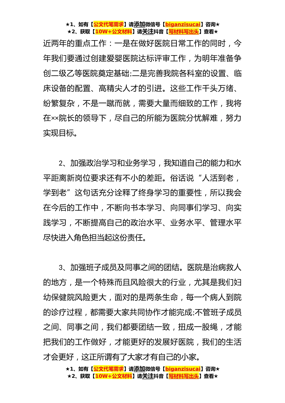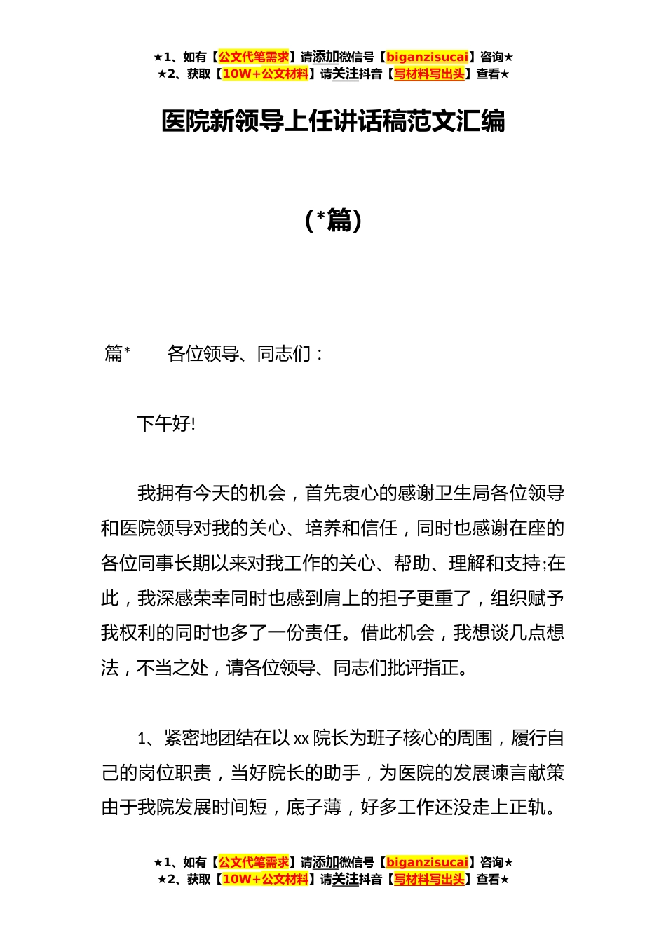 ★1、如有【公文代笔需求】请添加微信号【biganzisucai】咨询★★2、获取【10W+公文材料】请关注抖音【写材料写出头】查看★医院新领导上任讲话稿范文汇编(*篇)篇*各位领导、同志们:下午好!我拥有今天的机会,首先衷心的感谢卫生局各位领导和医院领导对我的关心、培养和信任,同时也感谢在座的各位同事长期以来对我工作的关心、帮助、理解和支持;在此,我深感荣幸同时也感到肩上的担子更重了,组织赋予我权利的同时也多了一份责任。借此机会,我想谈几点想法,不当之处,请各位领导、同志们批评指正。1、紧密地团结在以xx院长为班子核心的周围,履行自己的岗位职责,当好院长的助手,为医院的发展谏言献策由于我院发展时间短,底子薄,好多工作还没走上正轨。★1、如有【公文代笔需求】请添加微信号【biganzisu...