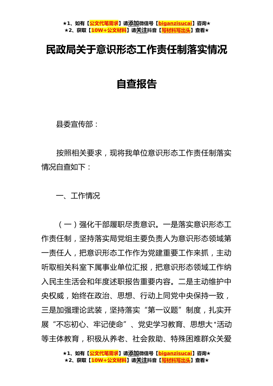 ★1、如有【公文代笔需求】请添加微信号【biganzisucai】咨询★★2、获取【10W+公文材料】请关注抖音【写材料写出头】查看★民政局关于意识形态工作责任制落实情况自查报告县委宣传部:按照相关要求,现将我单位意识形态工作责任制落实情况自查如下:一、工作情况(一)强化干部履职尽责意识。一是落实意识形态工作责任制,坚持落实局党组主要负责人为意识形态领域第一责任人,把意识形态工作作为党建重要工作来抓,主动听取相关科室下属事业单位汇报,把意识形态领域工作纳入民主生活会和年度述职报告重要内容。二是主动维护中央权威,始终在政治、思想、行动上同党中央保持一致,三是加强理论武装,坚持落实“第一议题”制度,扎实开展“不忘初心、牢记使命”、党史学习教育、思想大*活动等主体教育,积极从养老...