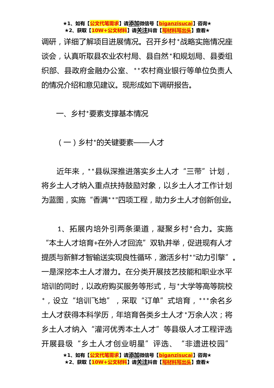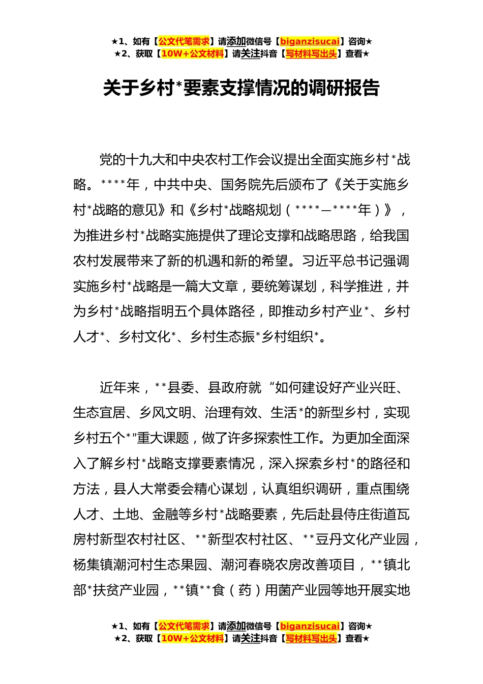 ★1、如有【公文代笔需求】请添加微信号【biganzisucai】咨询★★2、获取【10W+公文材料】请关注抖音【写材料写出头】查看★关于乡村*要素支撑情况的调研报告党的十九大和中央农村工作会议提出全面实施乡村*战略。****年,中共中央、国务院先后颁布了《关于实施乡村*战略的意见》和《乡村*战略规划(****—****年)》,为推进乡村*战略实施提供了理论支撑和战略思路,给我国农村发展带来了新的机遇和新的希望。习近平总书记强调实施乡村*战略是一篇大文章,要统筹谋划,科学推进,并为乡村*战略指明五个具体路径,即推动乡村产业*、乡村人才*、乡村文化*、乡村生态振*乡村组织*。近年来,**县委、县政府就“如何建设好产业兴旺、生态宜居、乡风文明、治理有效、生活*的新型乡村,实现乡村五个*”重大课题,做了许...
