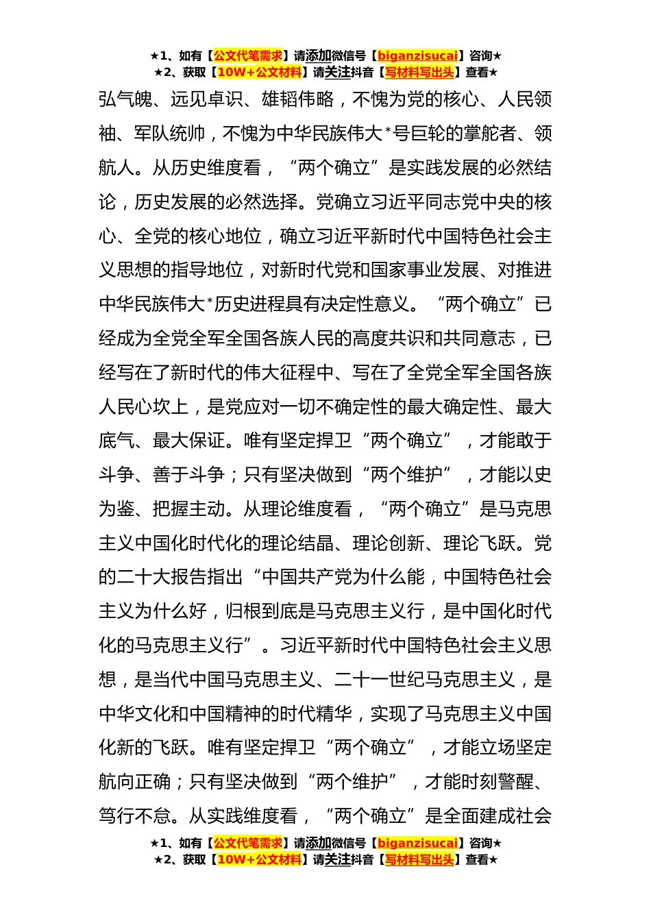 ★1、如有【公文代笔需求】请添加微信号【biganzisucai】咨询★★2、获取【10W+公文材料】请关注抖音【写材料写出头】查看★全面推进中华民族伟大*保驾护航党课讲稿党的二十大报告高屋建瓴、思想深邃、站位高远、视野宏阔,是党团结带领全国各族人民夺取中国特色社会主义新胜利的政治宣言和行动纲领、击鼓催征的动员号令。全省*机关将以时时忠诚、处处看齐、事事紧跟的政治自觉,不忘初心、牢记使命,踔厉奋发、勇毅前行,坚决扛起*全面*全方位*的*担当,为全面建设社会主义现代化国家、全面推进中华民族伟大*保驾护航。一、深学细研、凝心铸魂,坚决捍卫“两个确立”、坚决做到“两个维护”新时代十年,习近平总书记作为党中央的核心、全党的核心,在风云变幻中举旗定向、掌舵领航,在大战大考中指挥若定、运筹帷...