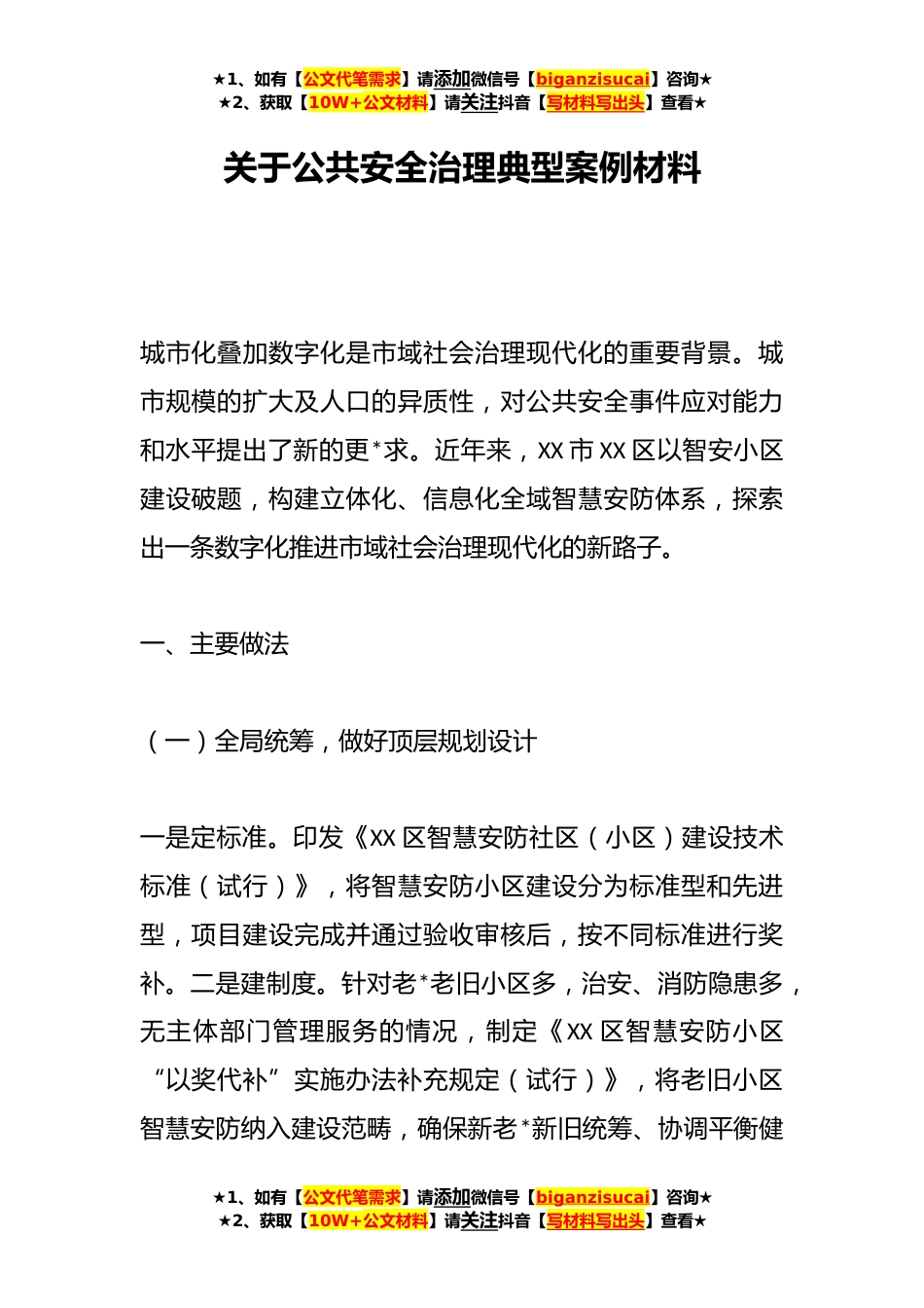 ★1、如有【公文代笔需求】请添加微信号【biganzisucai】咨询★★2、获取【10W+公文材料】请关注抖音【写材料写出头】查看★关于公共安全治理典型案例材料城市化叠加数字化是市域社会治理现代化的重要背景。城市规模的扩大及人口的异质性,对公共安全事件应对能力和水平提出了新的更*求。近年来,XX市XX区以智安小区建设破题,构建立体化、信息化全域智慧安防体系,探索出一条数字化推进市域社会治理现代化的新路子。一、主要做法(一)全局统筹,做好顶层规划设计一是定标准。印发《XX区智慧安防社区(小区)建设技术标准(试行)》,将智慧安防小区建设分为标准型和先进型,项目建设完成并通过验收审核后,按不同标准进行奖补。二是建制度。针对老*老旧小区多,治安、消防隐患多,无主体部门管理服务的情况,制...
