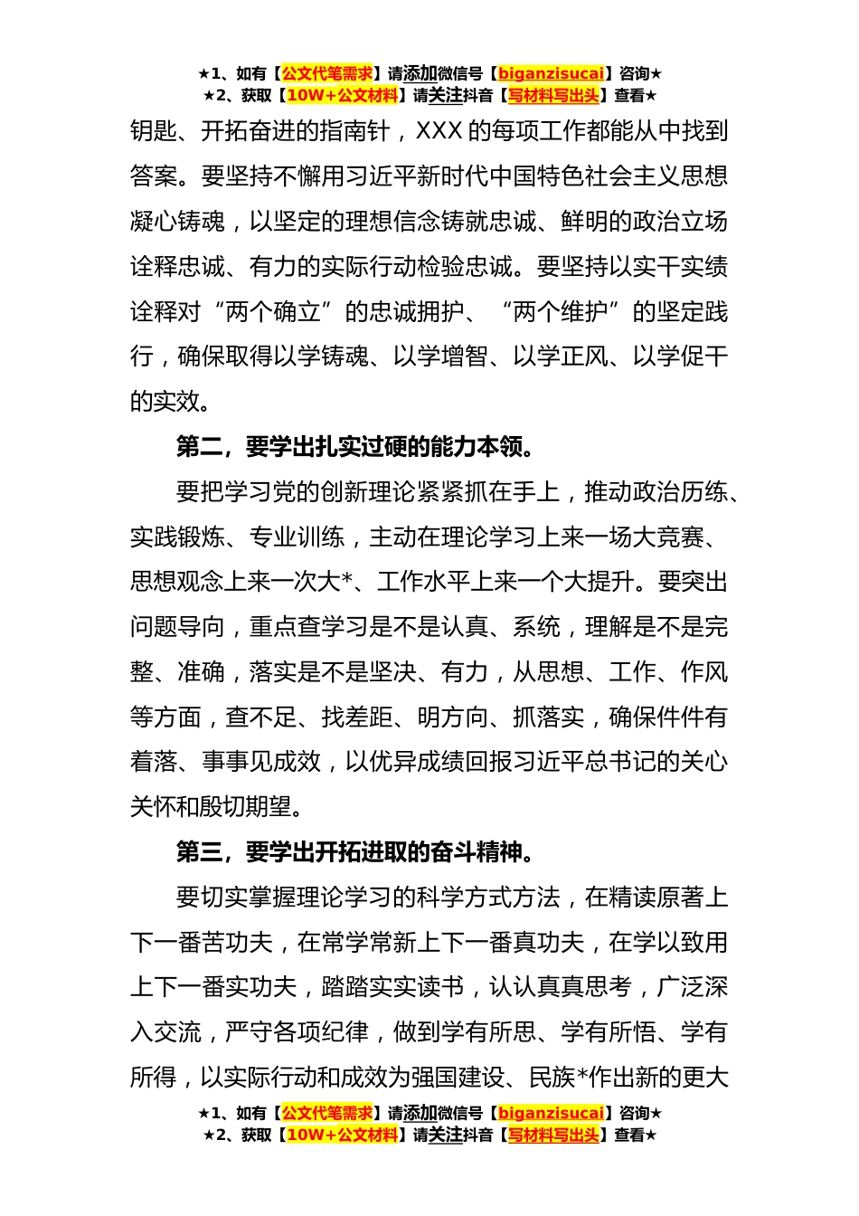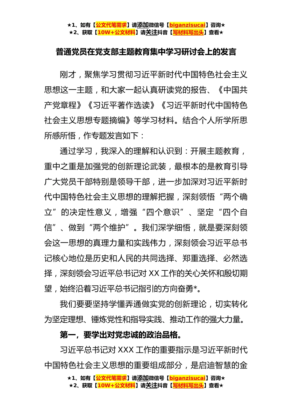 ★1、如有【公文代笔需求】请添加微信号【biganzisucai】咨询★★2、获取【10W+公文材料】请关注抖音【写材料写出头】查看★普通党员在党支部主题教育集中学习研讨会上的发言刚才,聚焦学习贯彻习近平新时代中国特色社会主义思想这一主题,和大家一起认真研读党的报告、《中国共产党章程》《习近平著作选读》《习近平新时代中国特色社会主义思想专题摘编》等学习材料。结合个人所学所思所感所悟,作专题发言如下:通过学习,我深入的理解和认识到:开展主题教育,重中之重是加强党的创新理论武装,最根本的是教育引导广大党员干部特别是领导干部,进一步加深对习近平新时代中国特色社会主义思想的理解把握,深刻领悟“两个确立”的决定性意义,增强“四个意识”、坚定“四个自信”、做到“两个维护”。我们深学细...